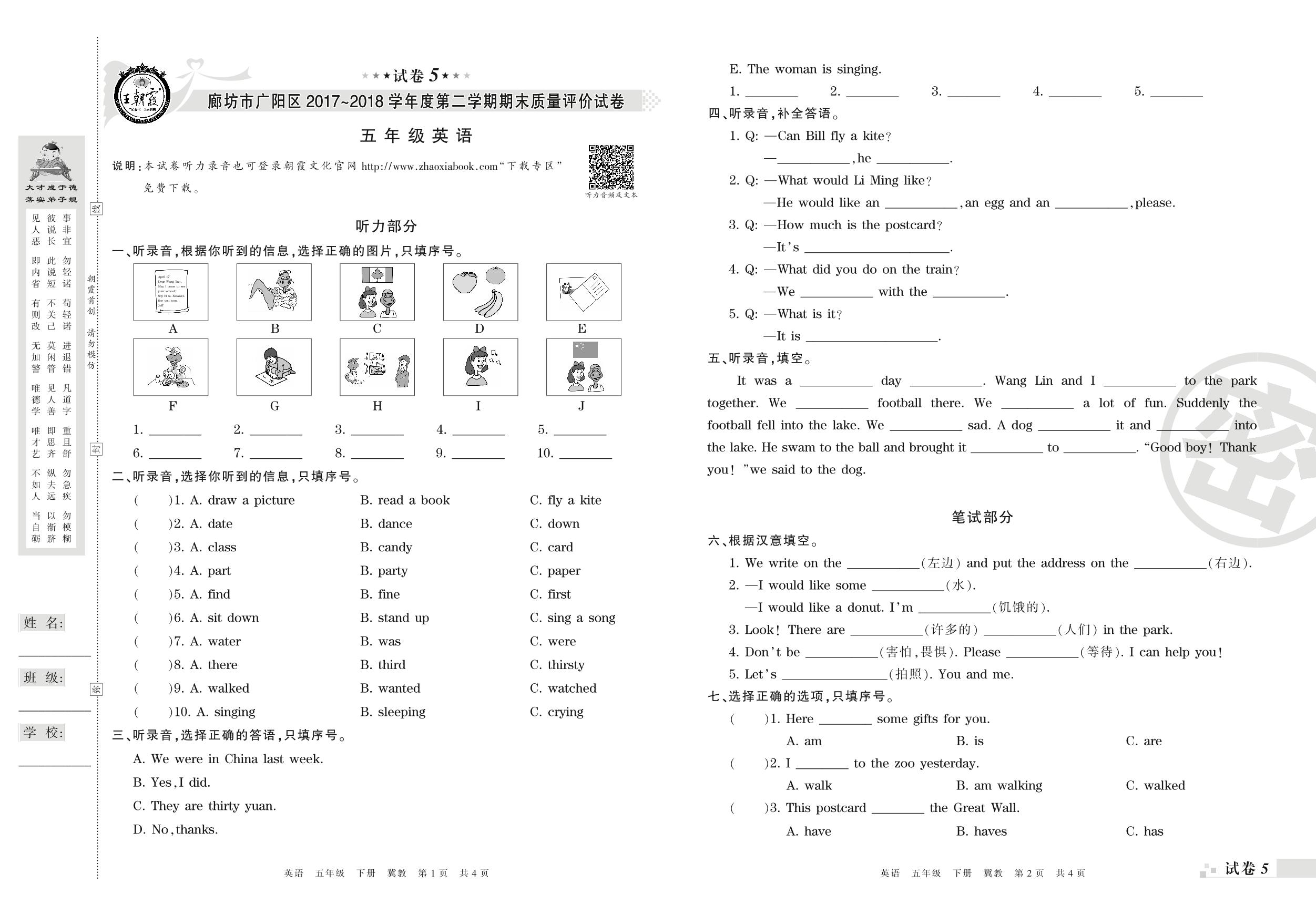2017-2018学年第二学期廊坊市广阳区五年级英语试卷(冀教版)【5】