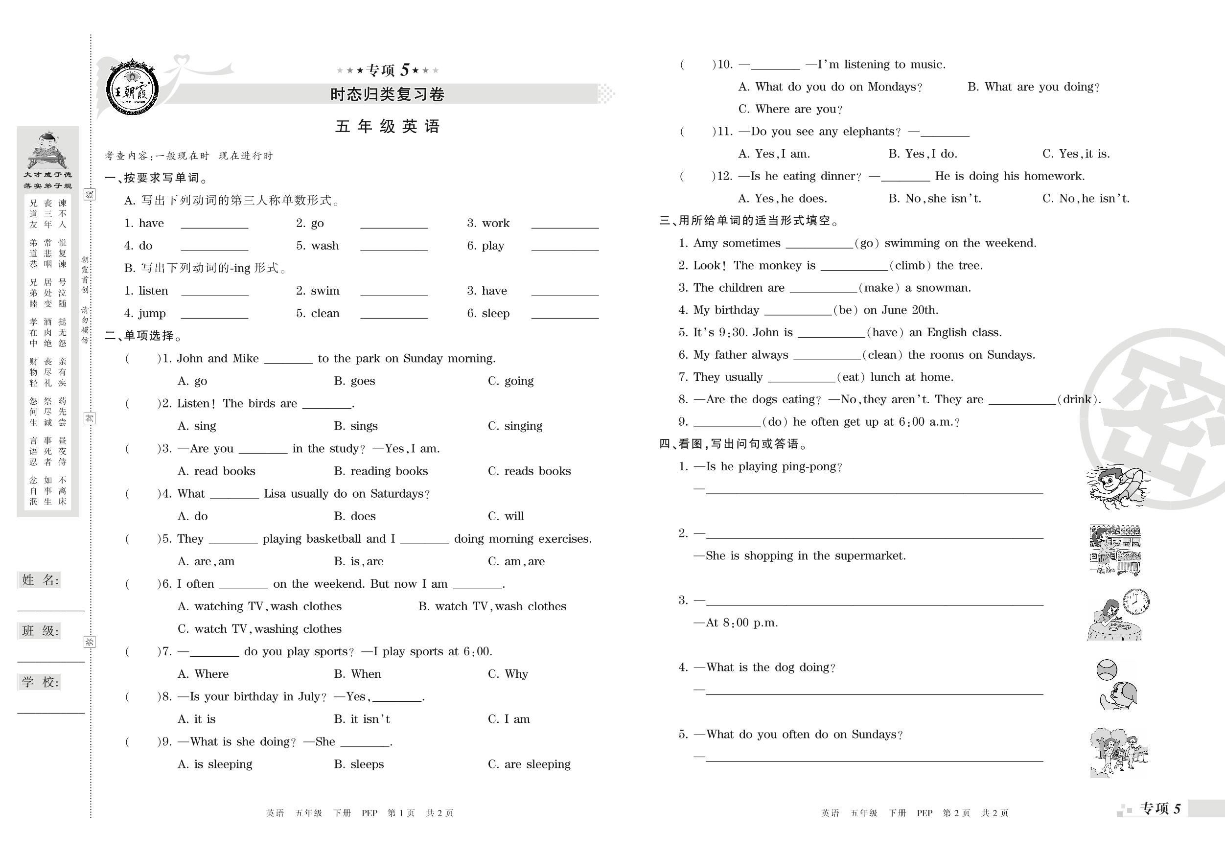 王朝霞期末专项卷——时态、情景交际真题归类复习卷五年级下册英语(PEP版)_R210807143942【0】