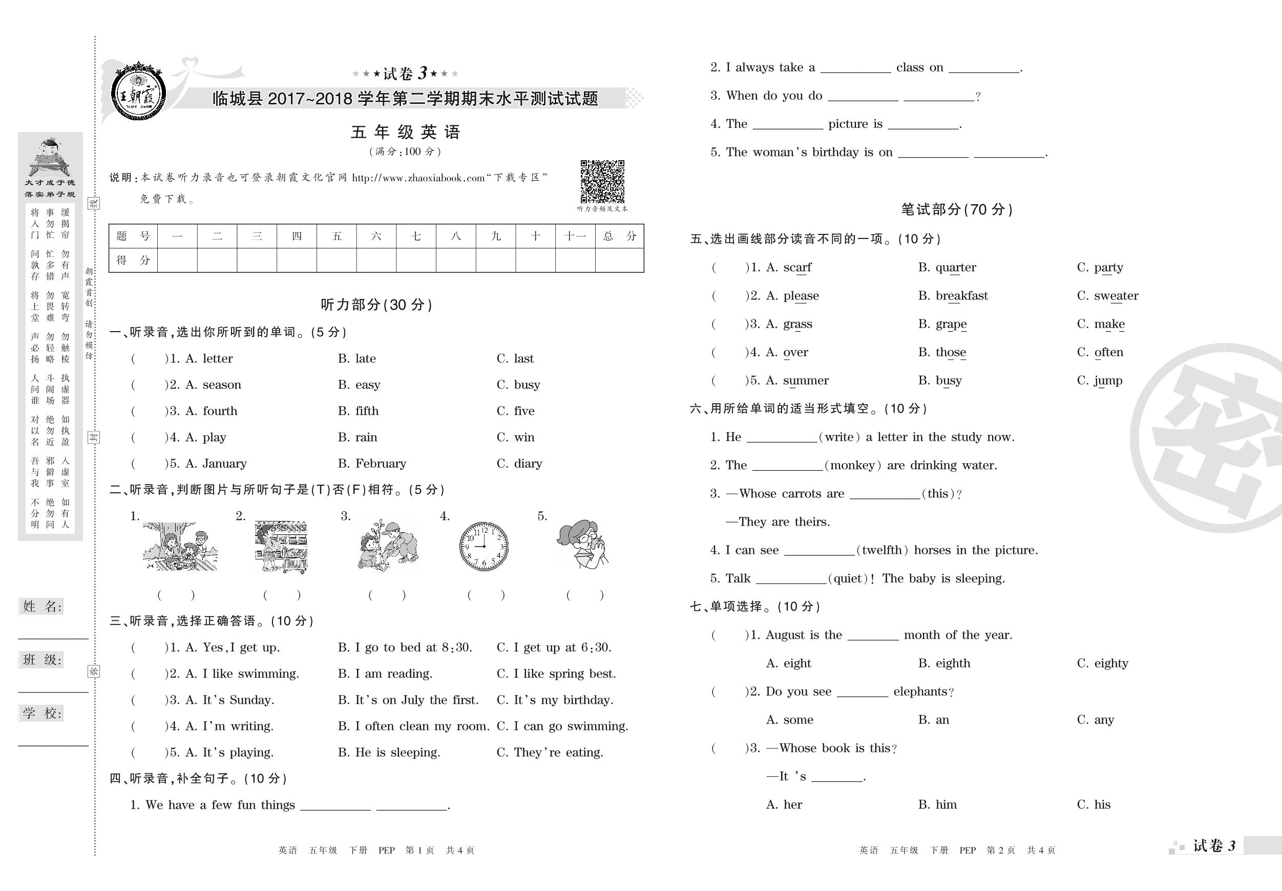 2017-2018学年第二学期邢台市临城县五年级英语试卷(PEP版)【3】