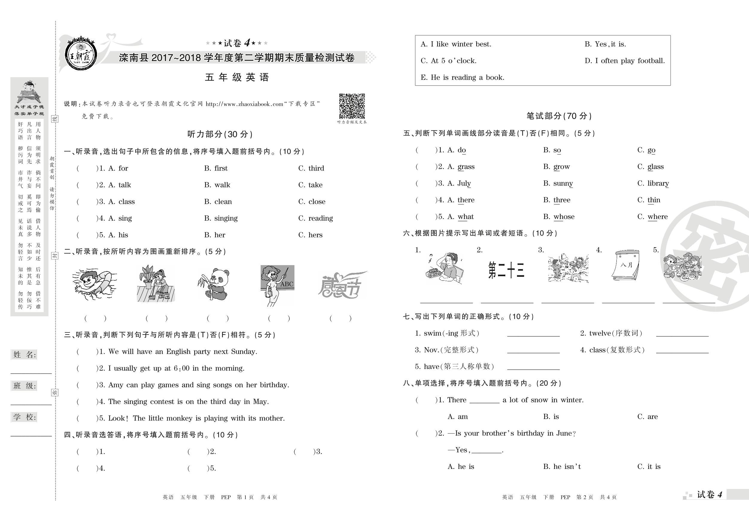 2017-2018学年第二学期唐山市滦南县五年级英语试卷(PEP版)【4】