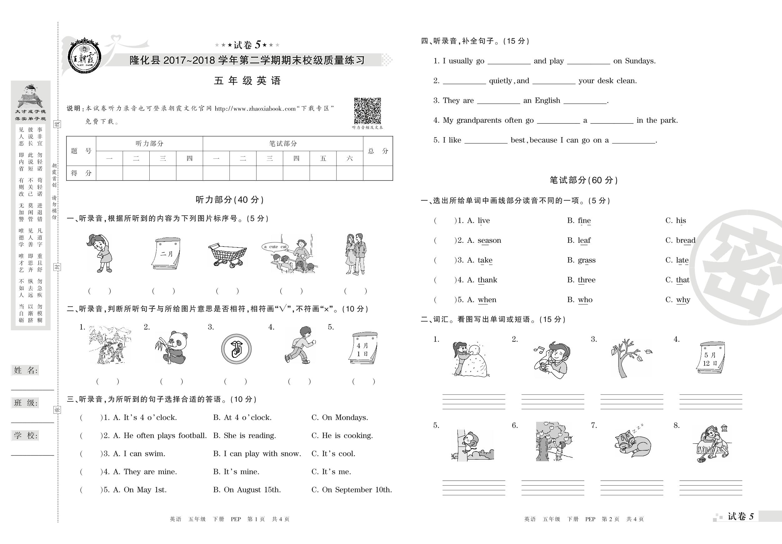 2017-2018学年第二学期承德市隆化县五年级英语试卷(PEP版)【5】