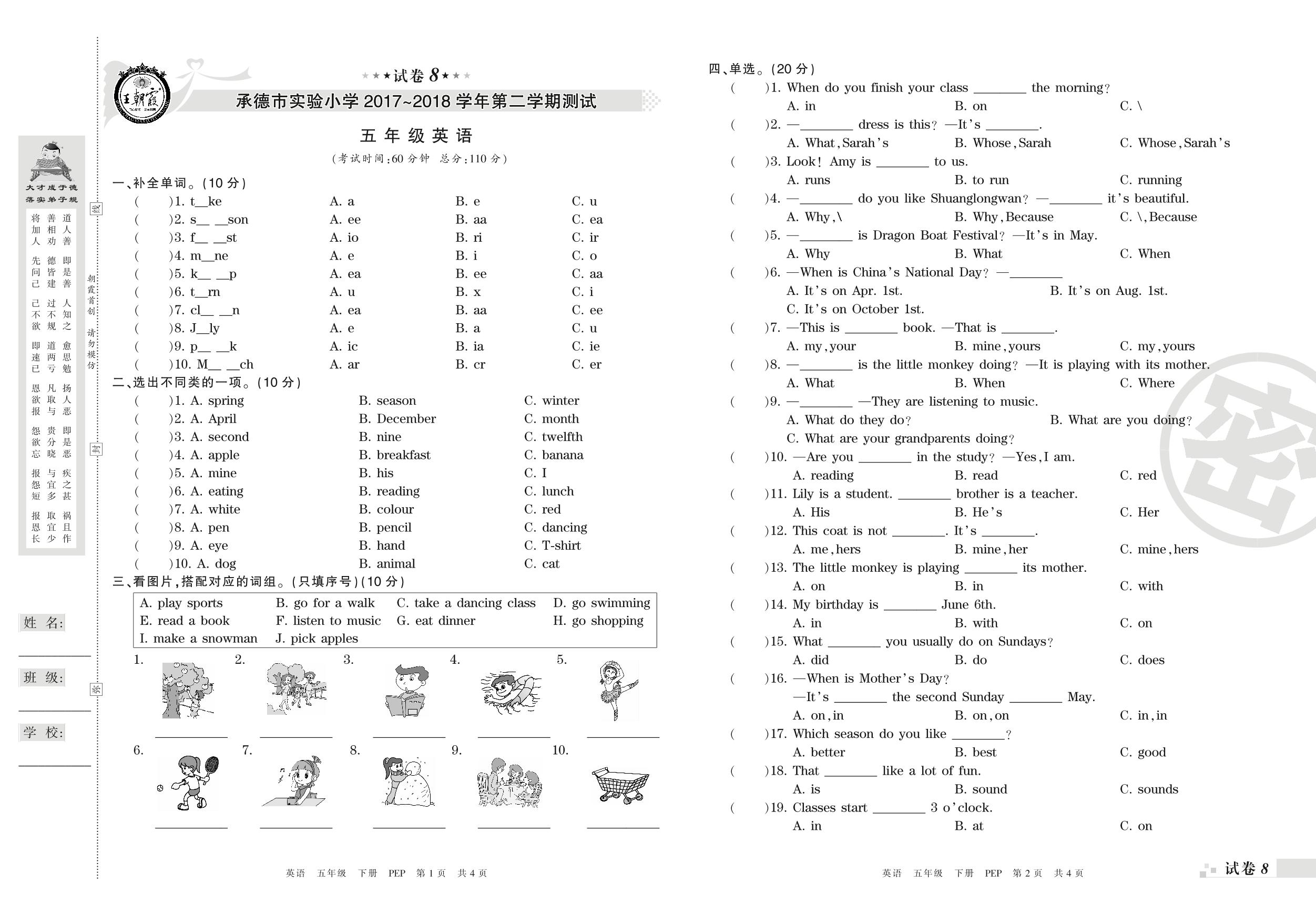 2017-2018学年第二学期承德市实验小学五年级英语试卷(PEP版)【8】