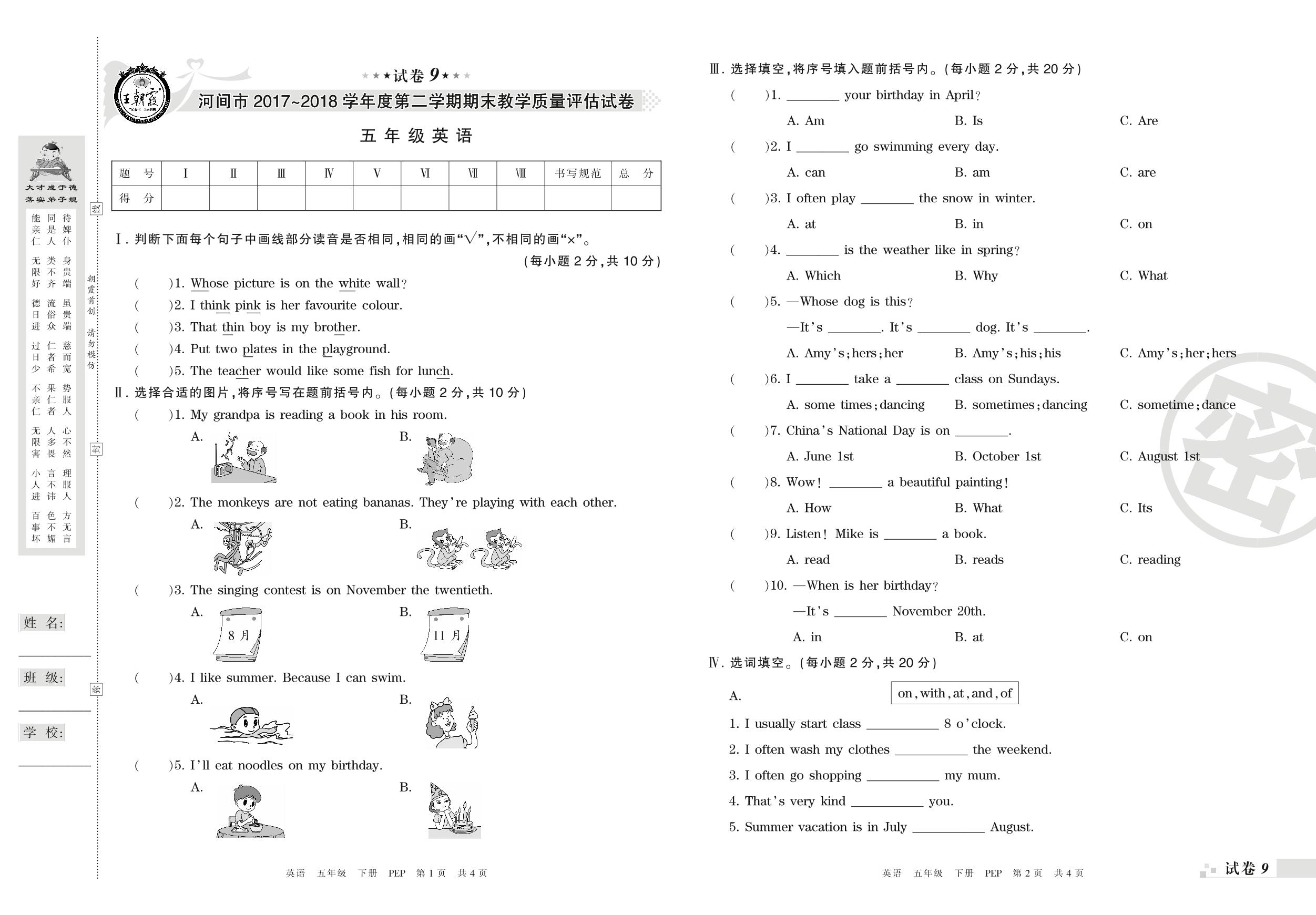 2017-2018学年第二学期河间市五年级英语试卷(PEP版)【9】
