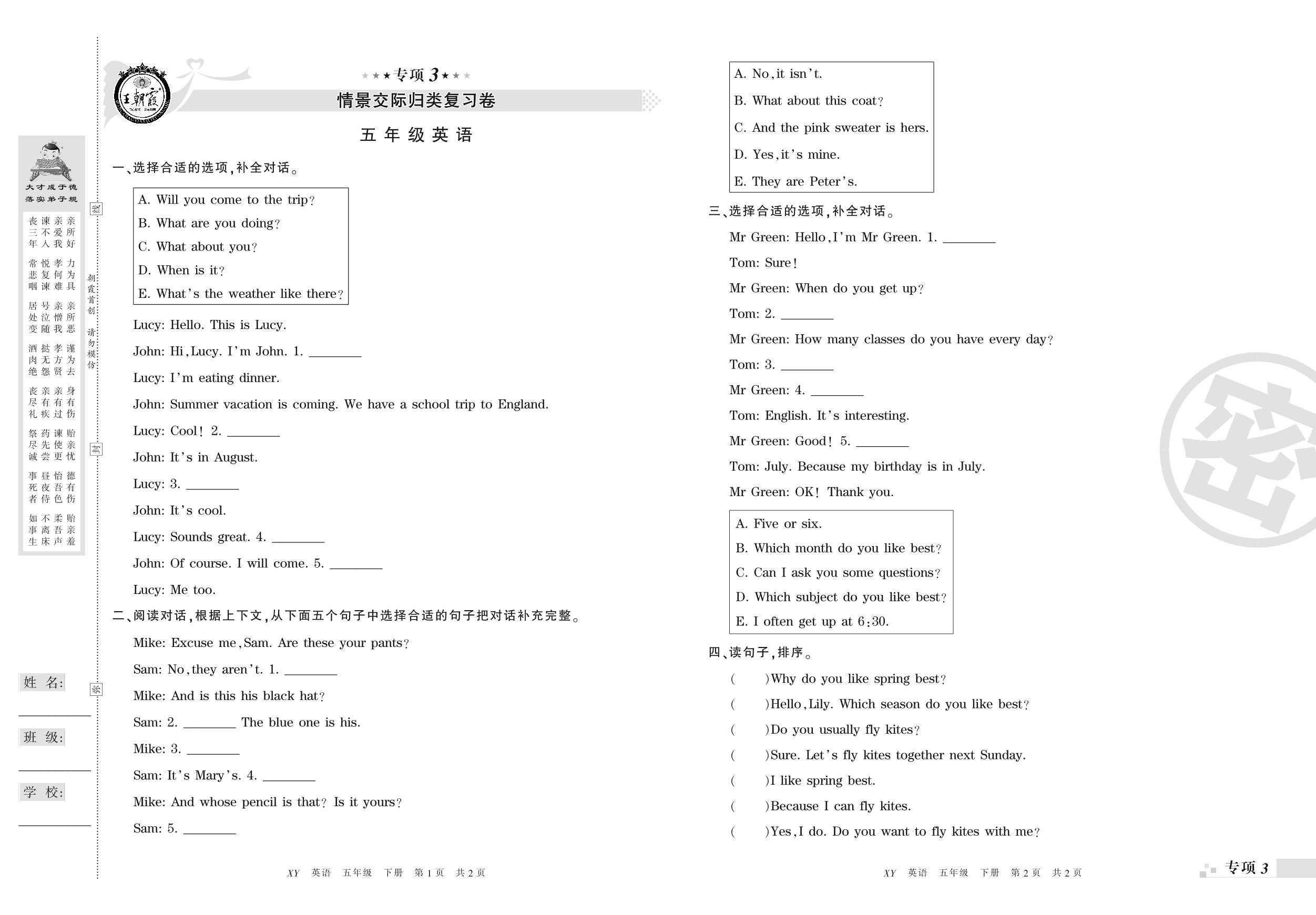 王朝霞期末专项卷——情景交际、阅读理解真题归类复习卷五年级下册英语(PEP版)_R210807144052【0】