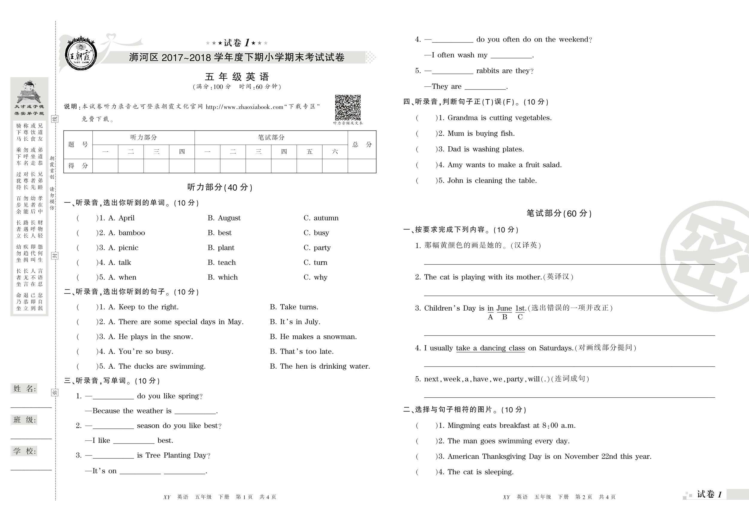 2017-2018学年第二学期信阳市浉河区五年级英语试卷(PEP版)【1】