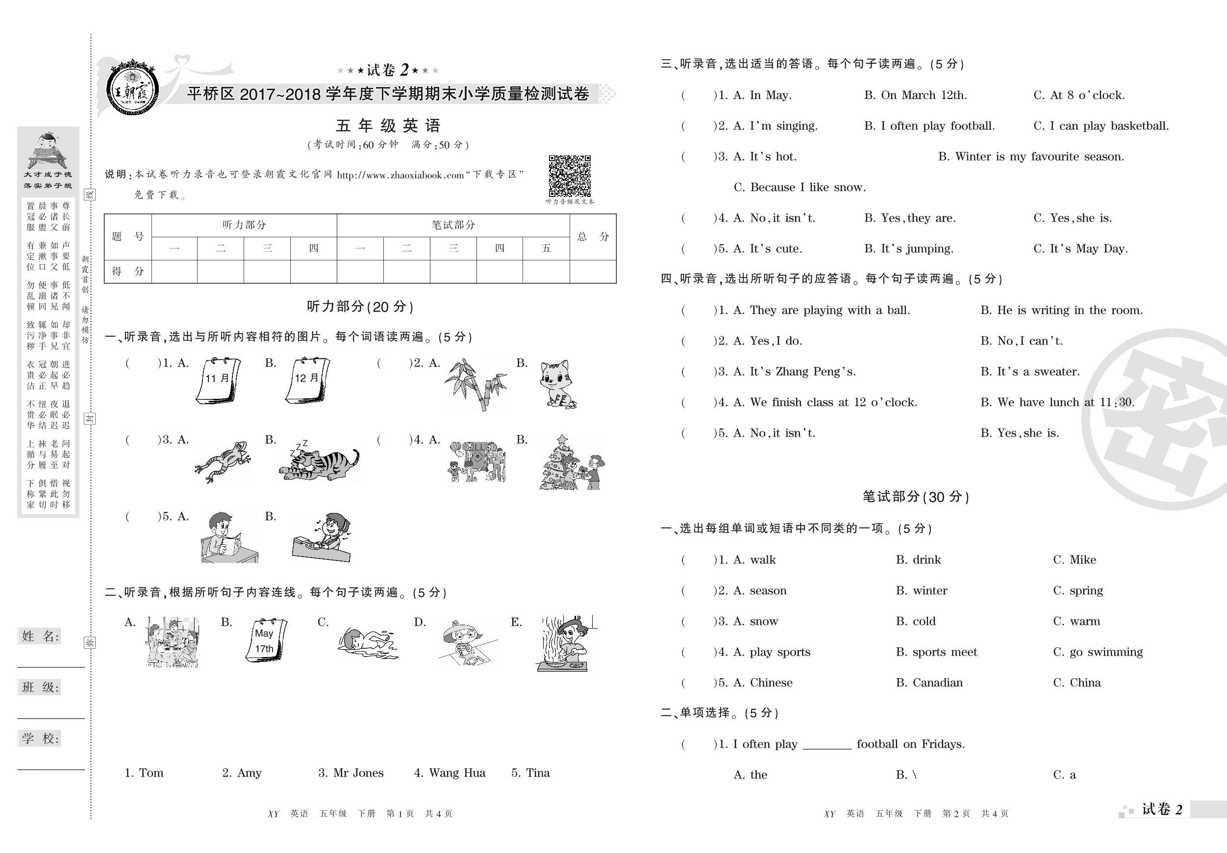 2017-2018学年第二学期信阳市平桥区五年级英语试卷(PEP版)【2】