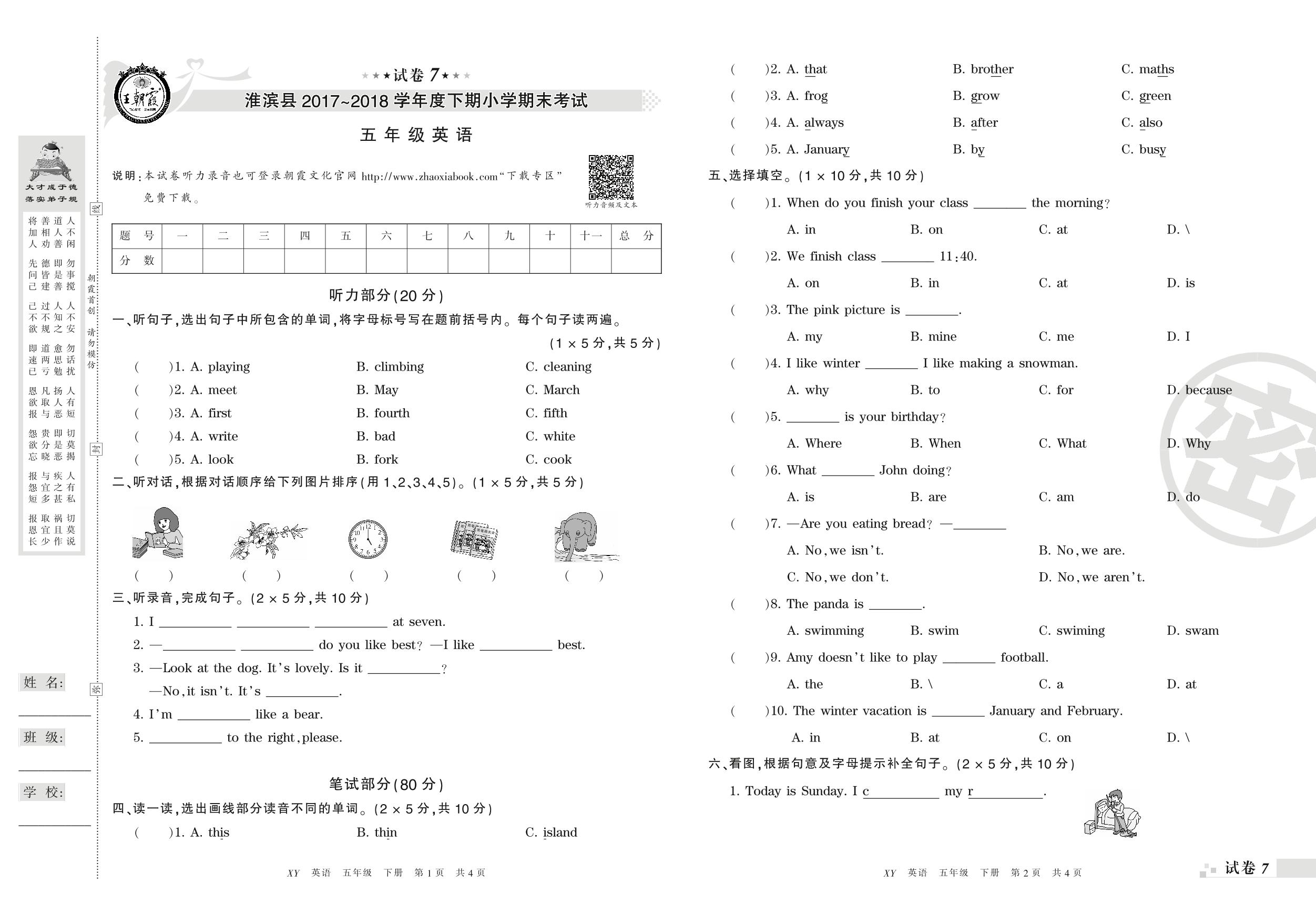 2017-2018学年第二学期信阳市淮滨县五年级英语试卷(PEP版)【7】