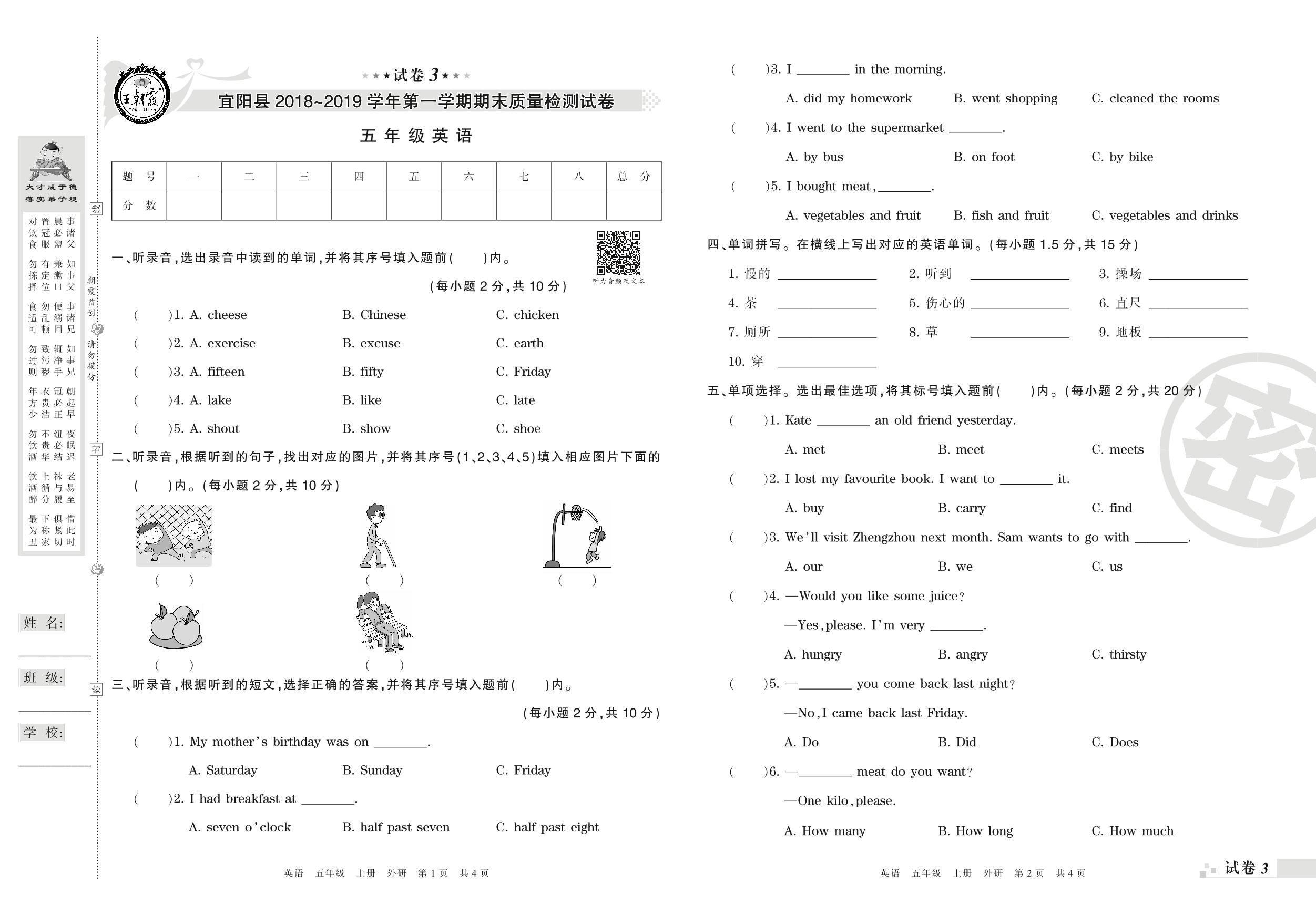 2018-2019学年第一学期洛阳市宜阳县五年级英语试卷(外研版)【3】