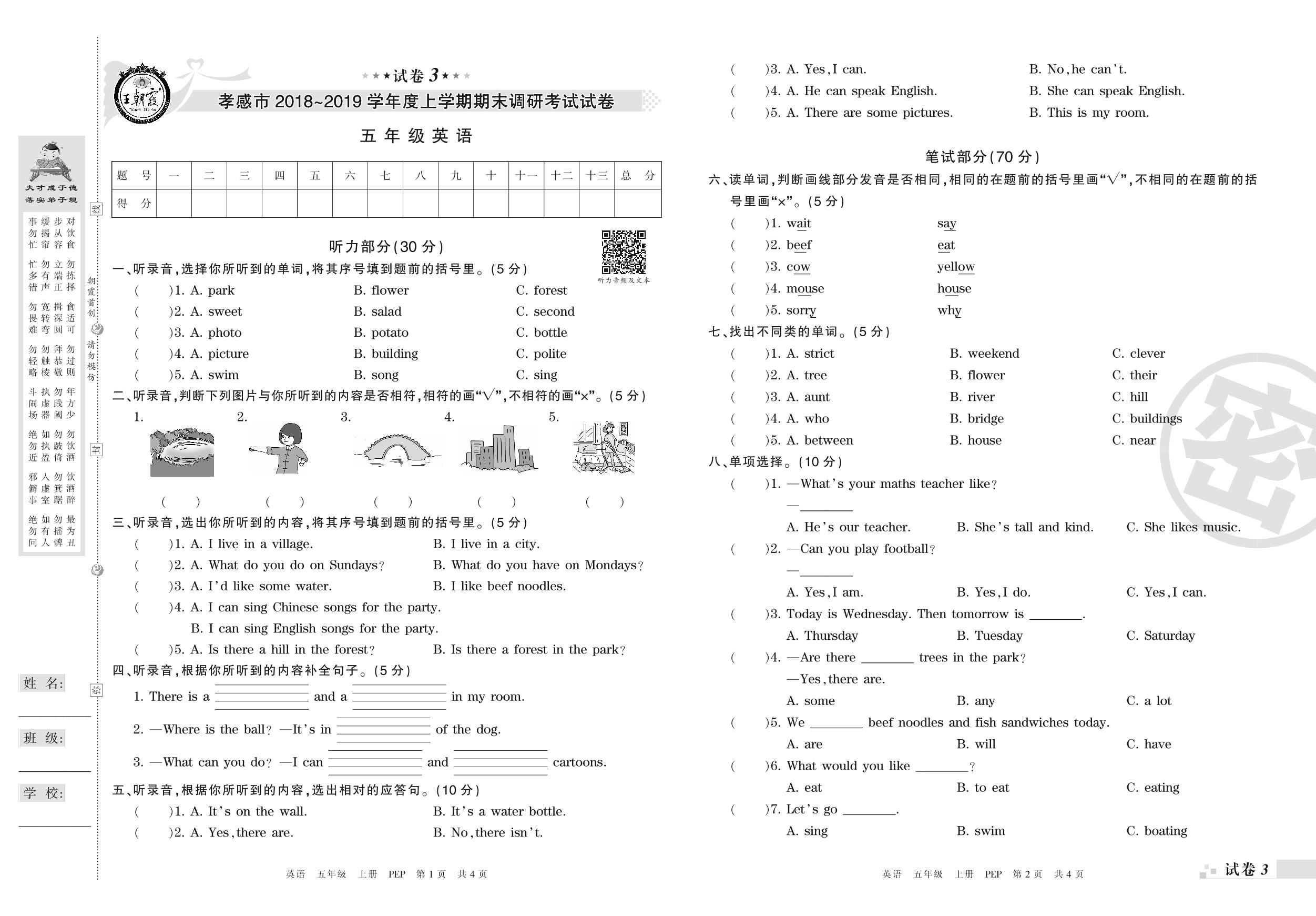 2018-2019学年第一学期孝感市五年级英语试卷(PEP版)【3】