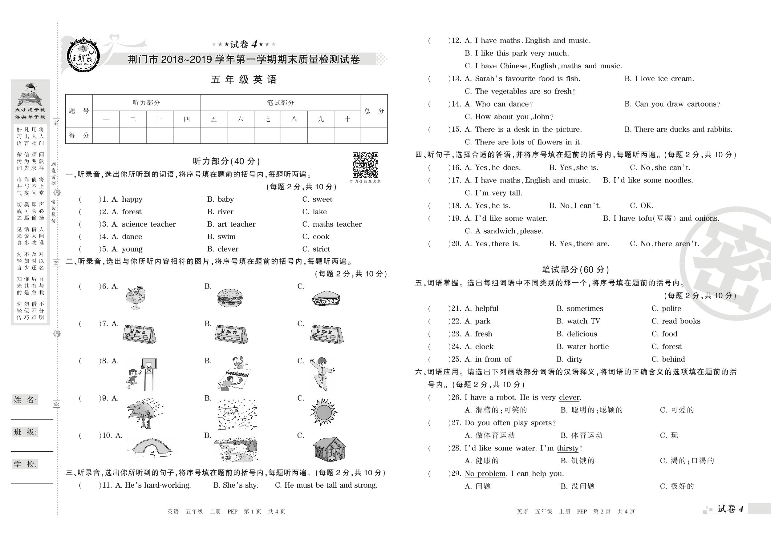 2018-2019学年第一学期荆门市五年级英语试卷(PEP版)【4】