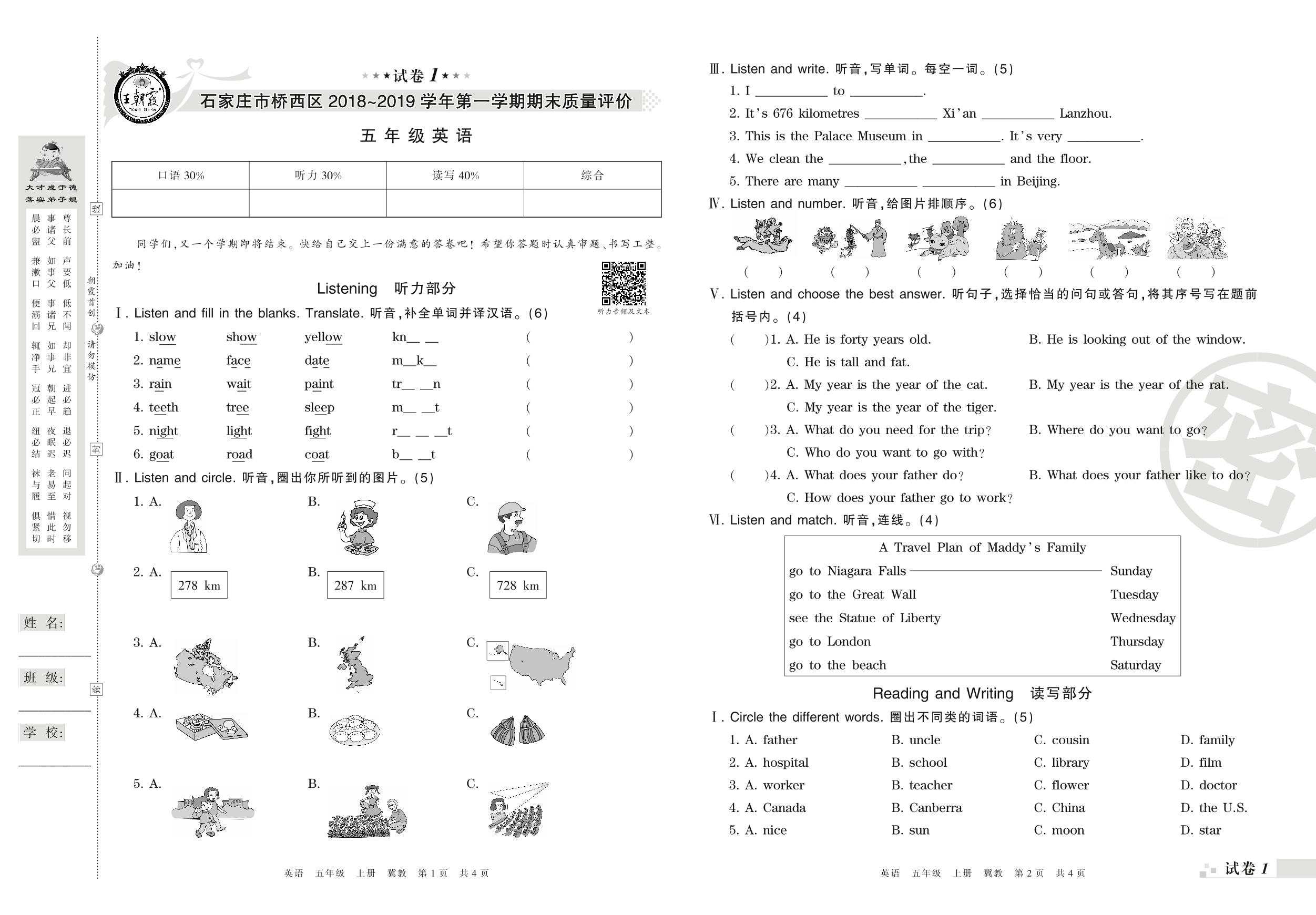 2018-2019学年第一学期石家庄市桥西区五年级英语试卷(冀教版)【1】