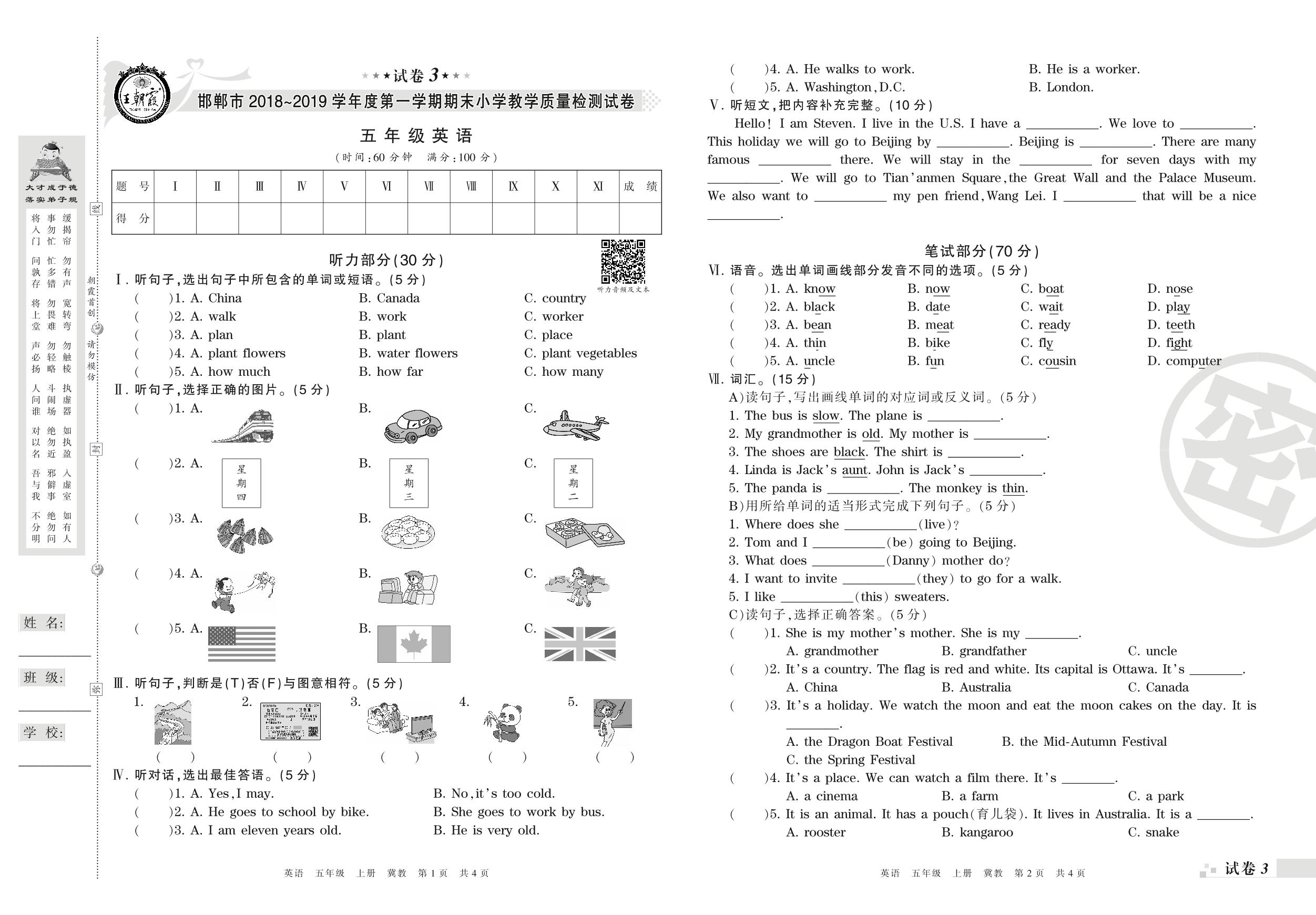 2018-2019学年第一学期邯郸市五年级英语试卷(冀教版)【3】