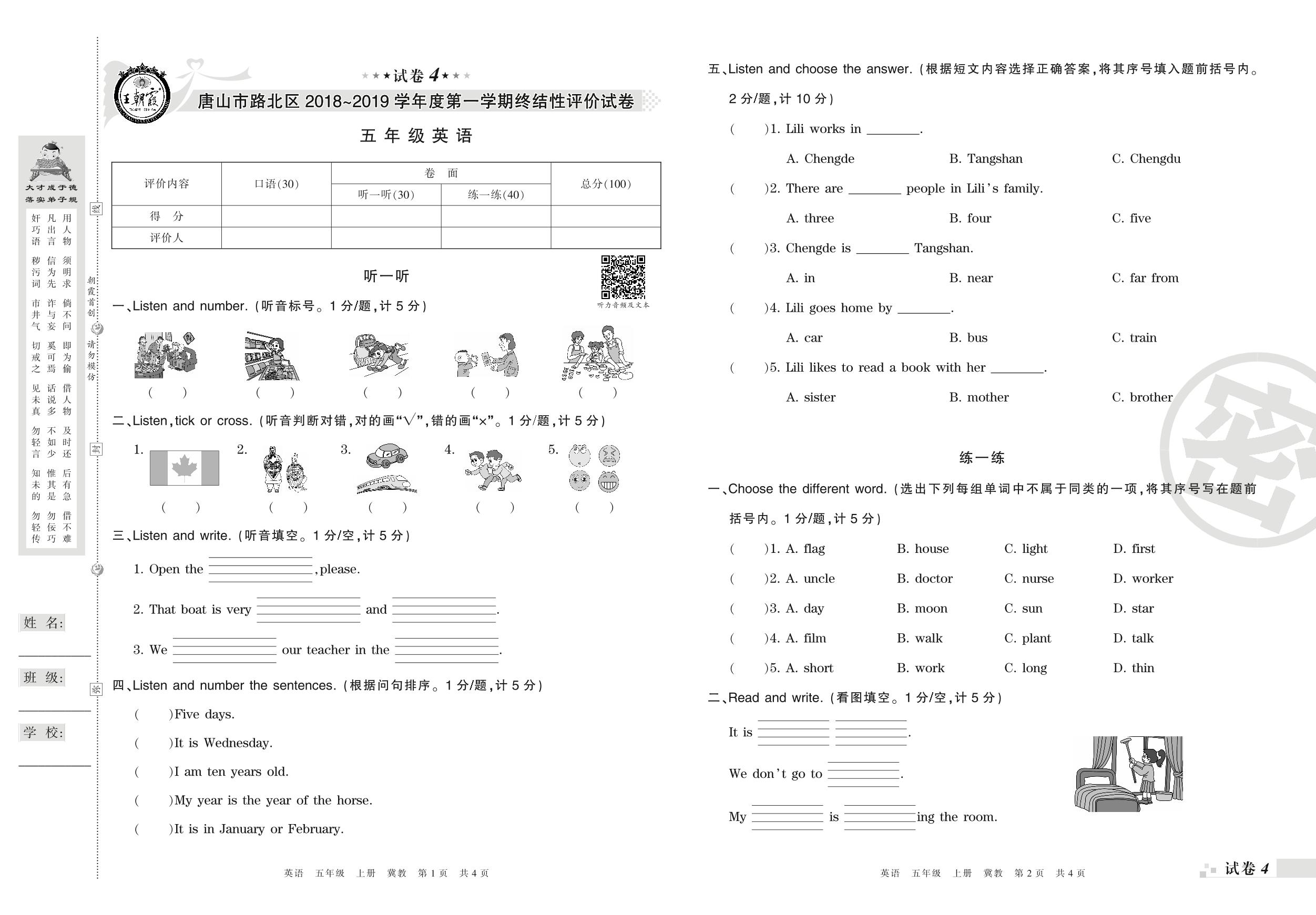 2018-2019学年第一学期唐山市路北区五年级英语试卷(冀教版)【4】