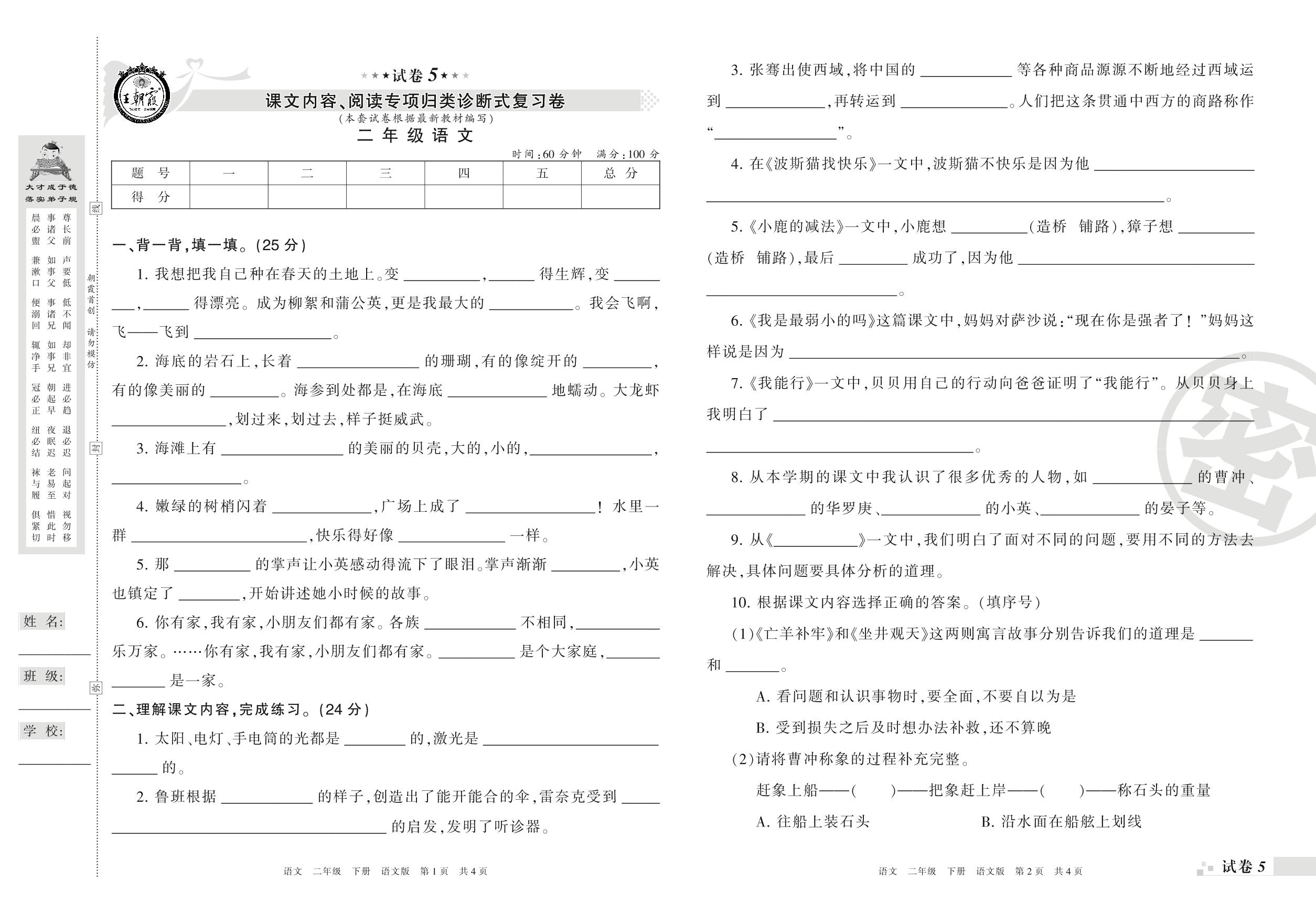 王朝霞期末专项卷——课文内容、阅读专项归类诊断式复习卷二年级下册语文(语文版)_R21080182244【5】