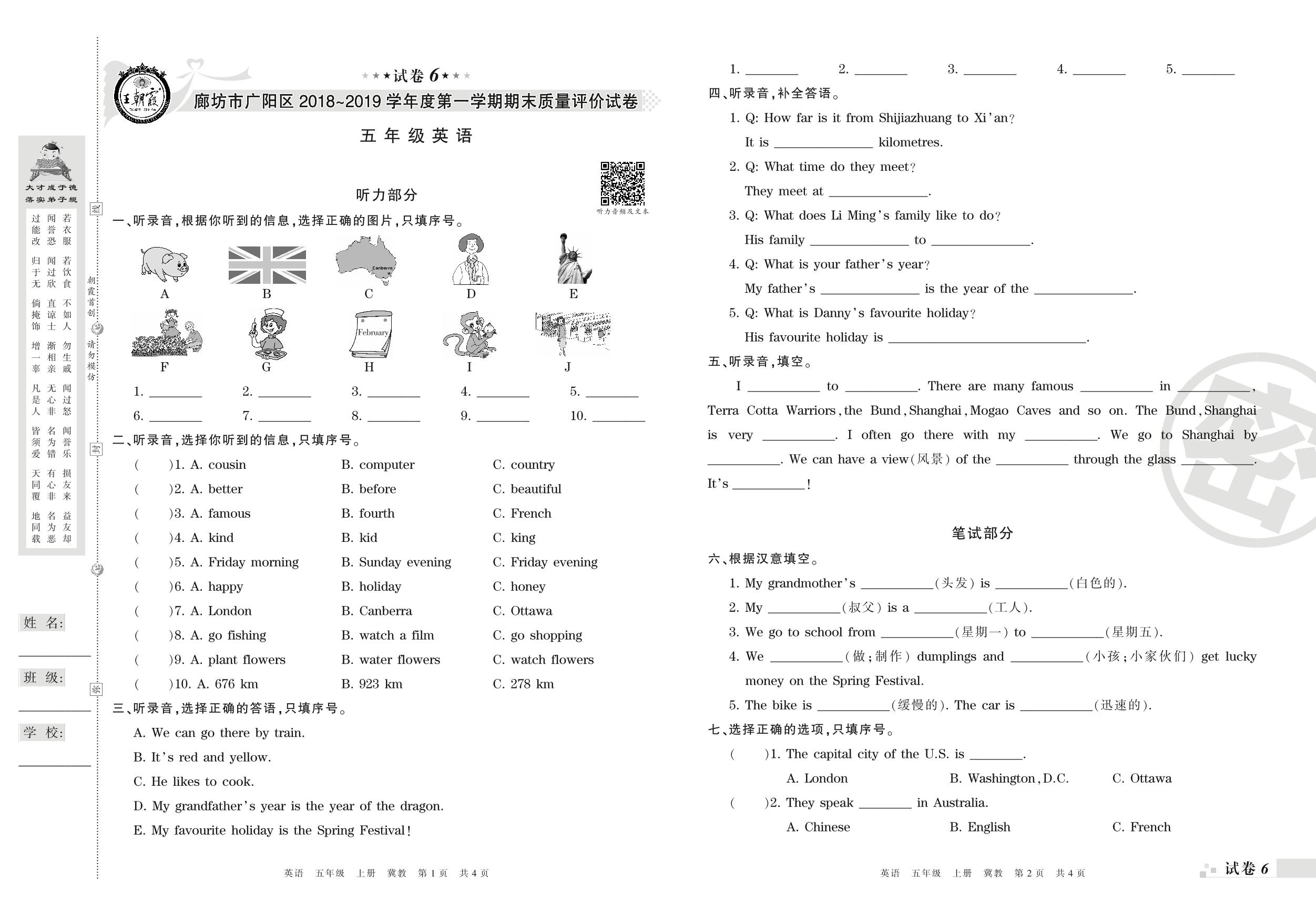 2018-2019学年第一学期廊坊市广阳区五年级英语试卷(冀教版)【6】