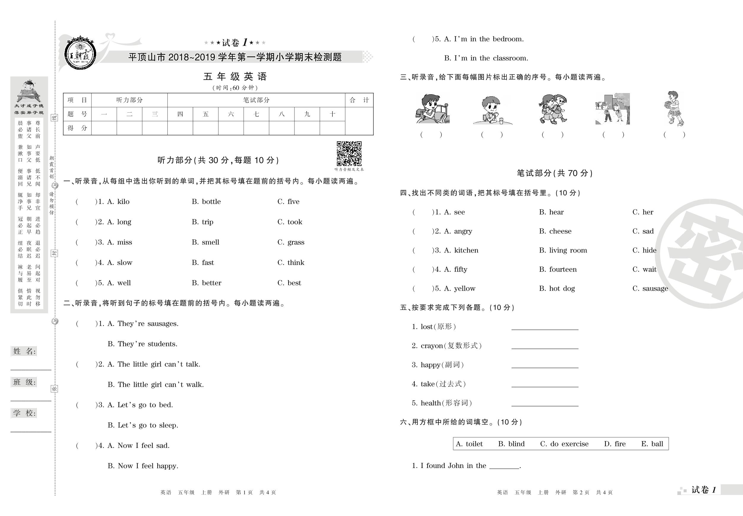 2018-2019学年第一学期平顶山市五年级英语试卷(外研版)【1】