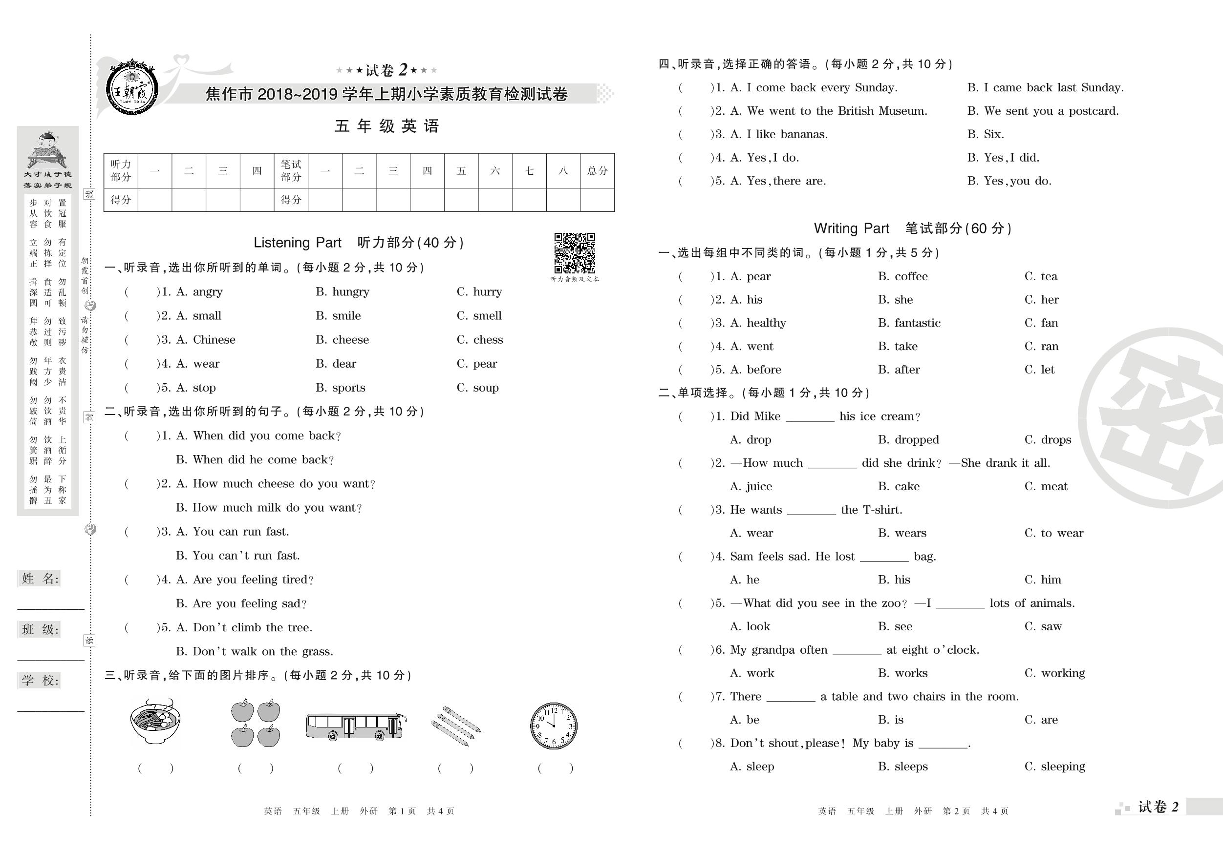2018-2019学年第一学期焦作市五年级英语试卷(外研版)【2】