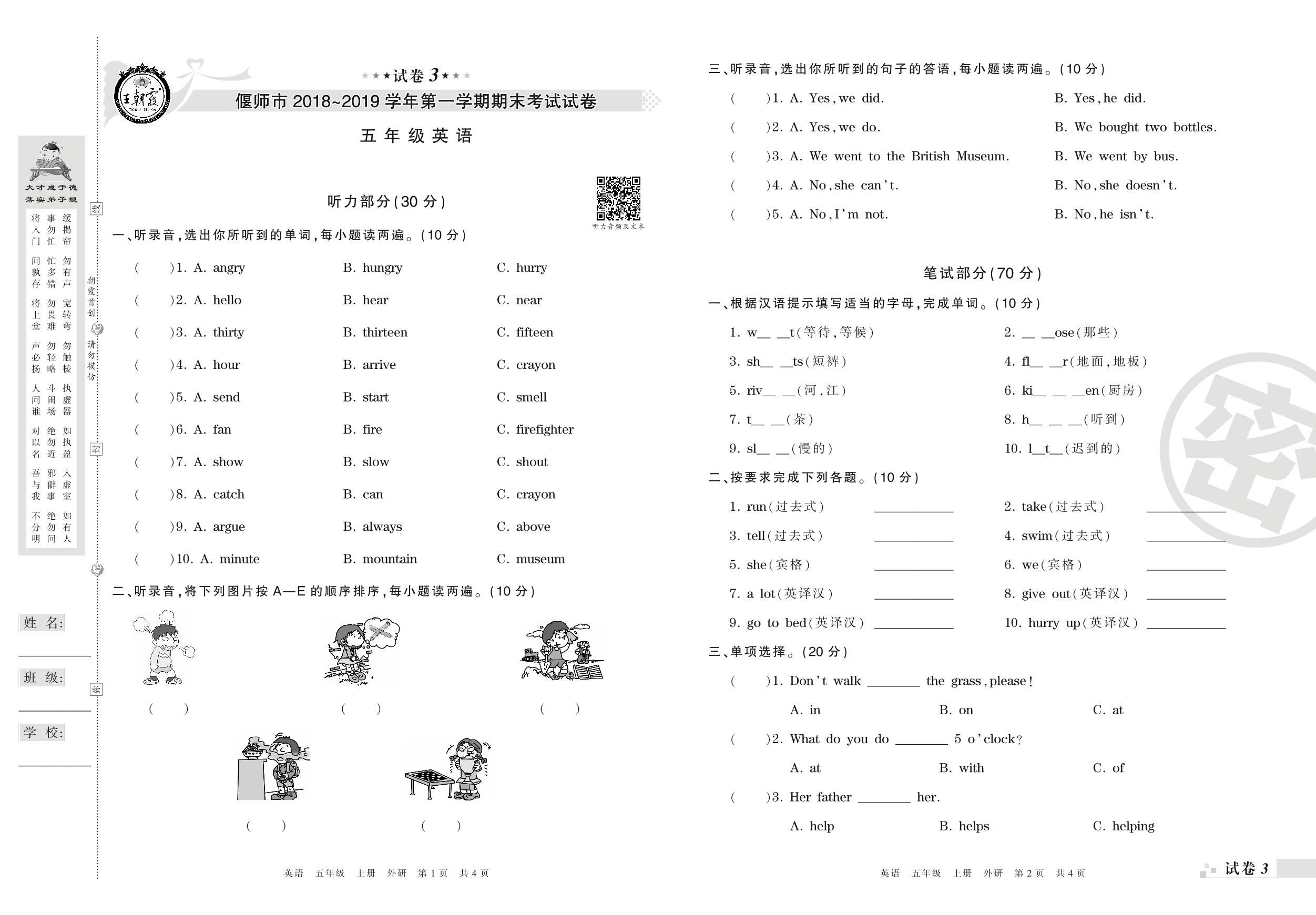 2018-2019学年第一学期偃师市五年级英语试卷(外研版)【3】