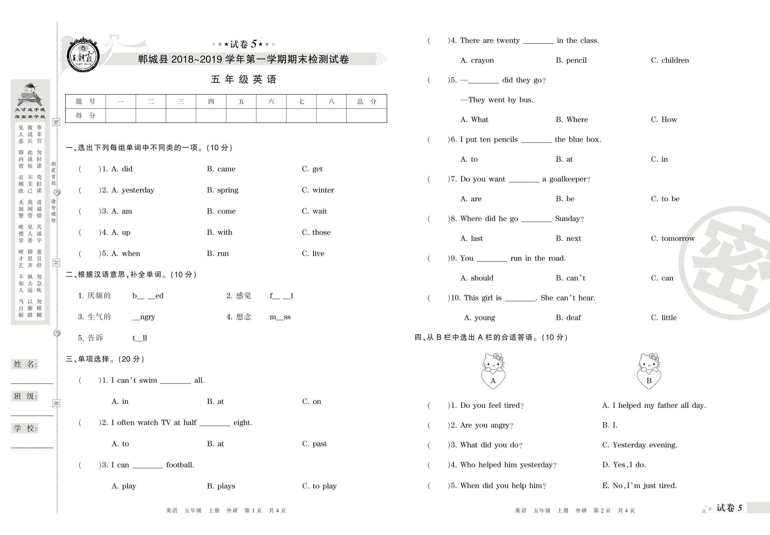 2018-2019学年第一学期周口市郸城县五年级英语试卷(外研版)【5】