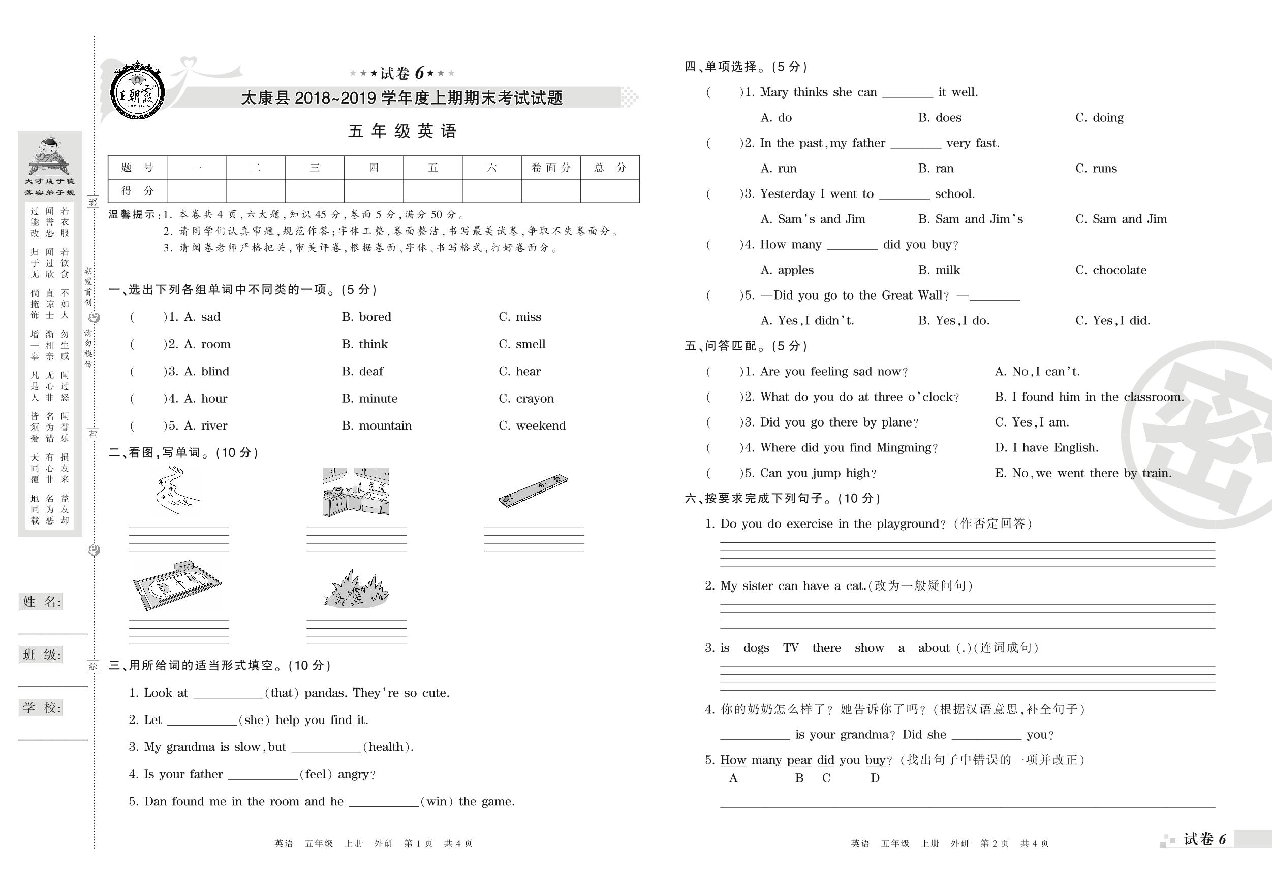 2018-2019学年第一学期周口市太康县五年级英语试卷(外研版)【6】