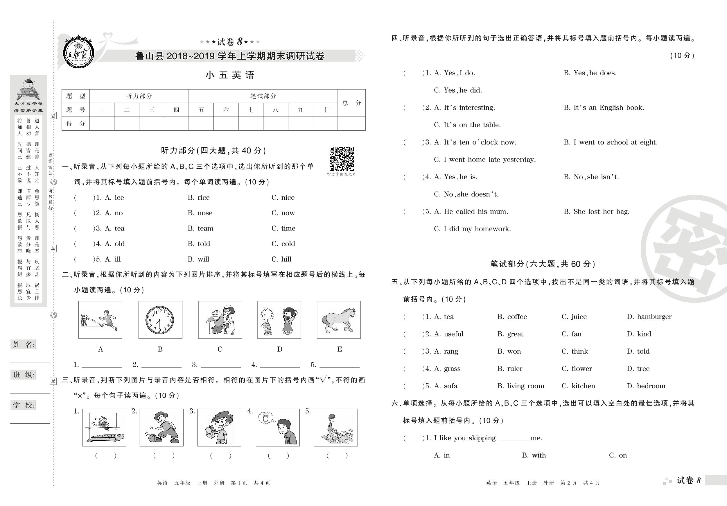 2018-2019学年第一学期平顶山市鲁山县五年级英语试卷(外研版)【8】