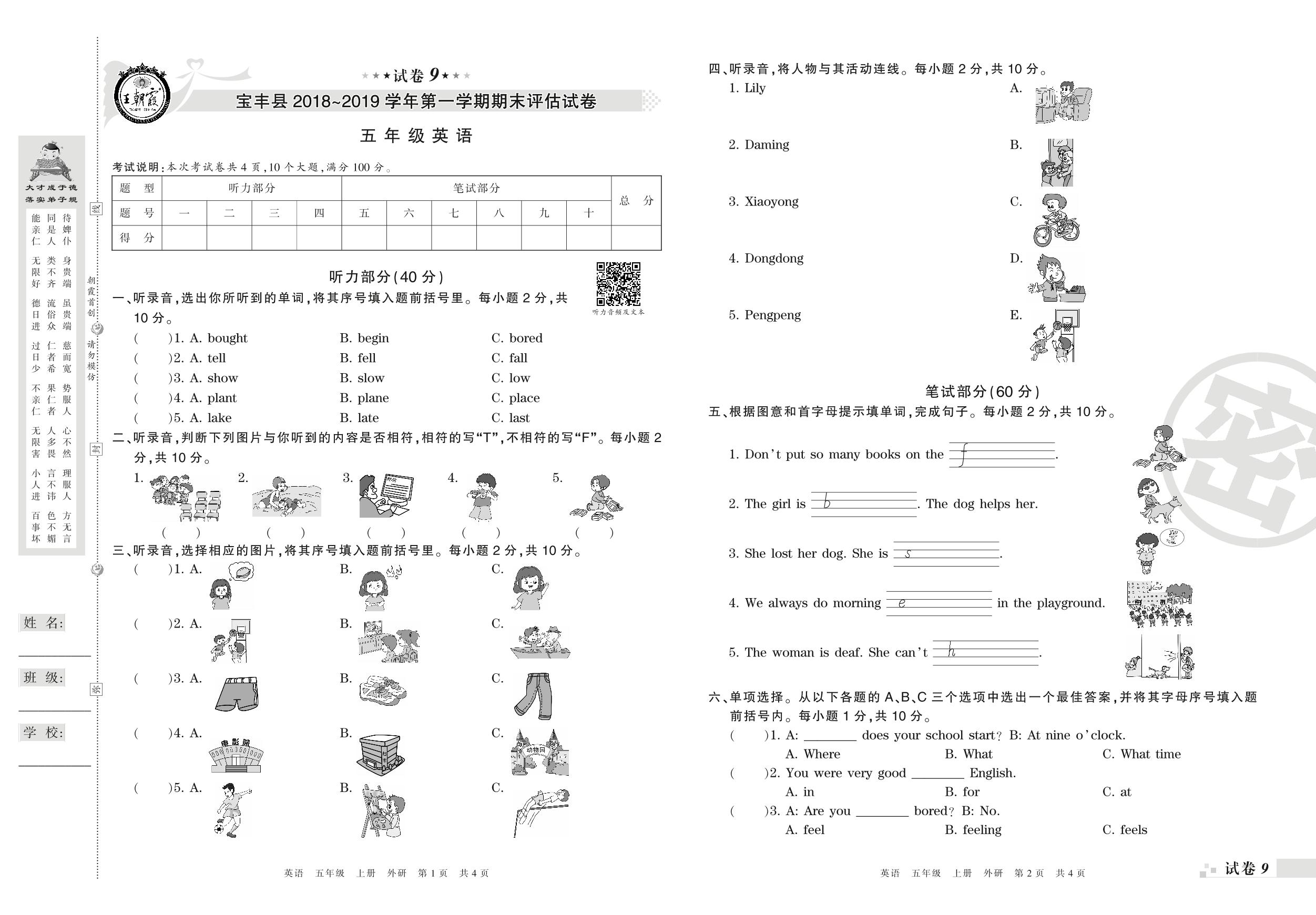 2018-2019学年第一学期平顶山市宝丰县五年级英语试卷(外研版)【9】