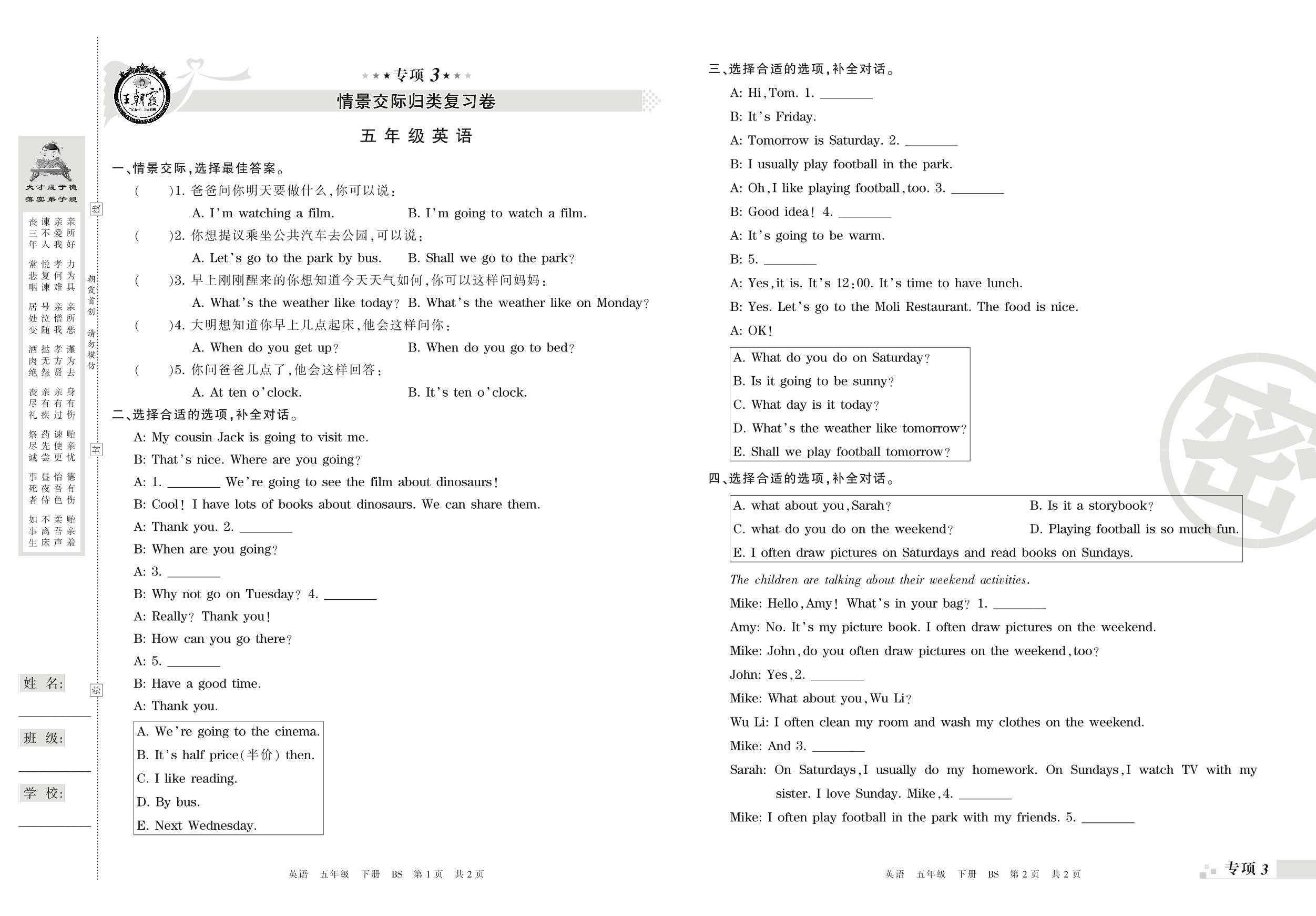 王朝霞期末专项卷——情景交际、阅读理解真题归类复习卷五年级下册英语(北师版)_R210807144541【0】
