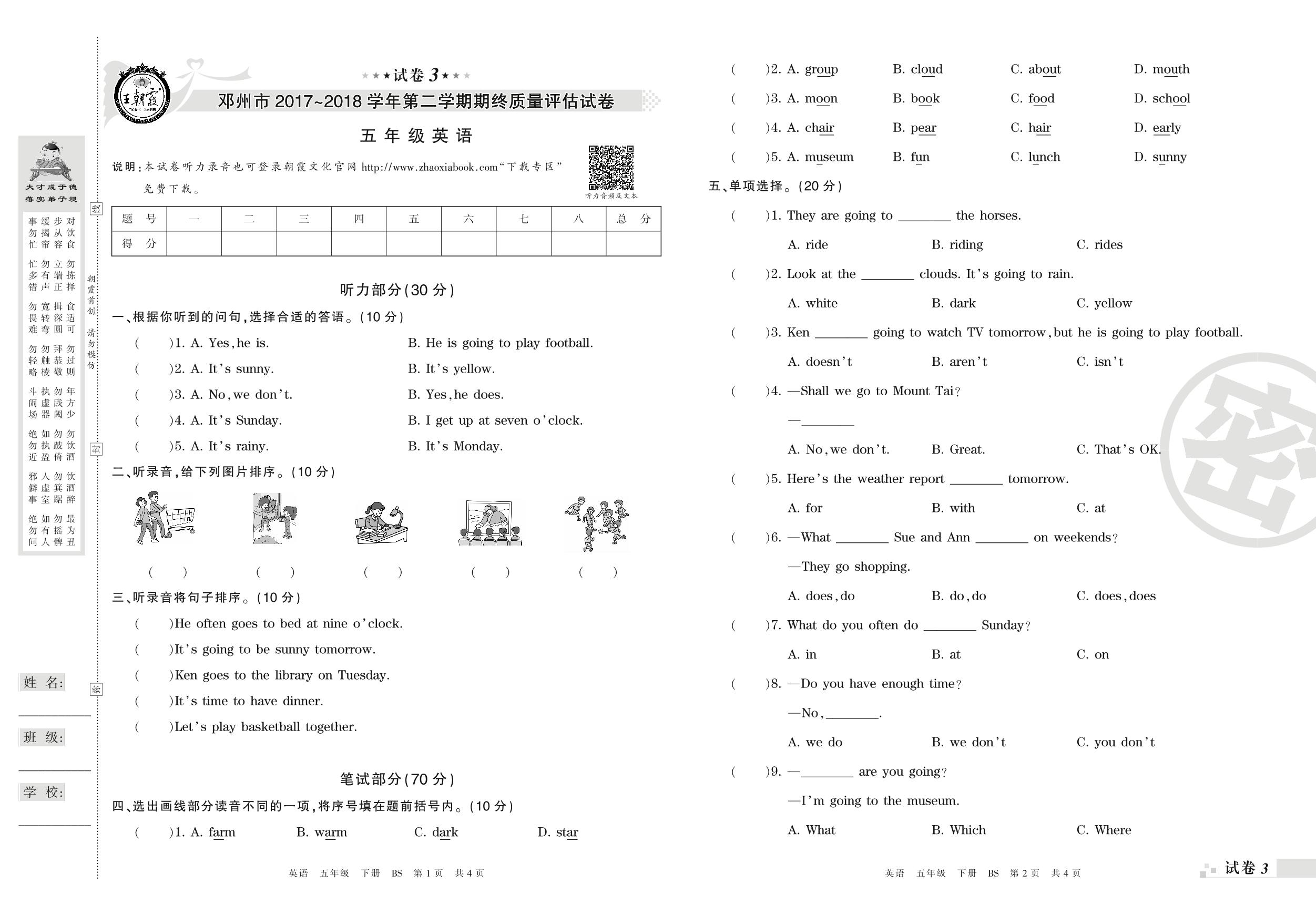 2017-2018学年第二学期邓州市五年级英语试卷(北师版)【3】