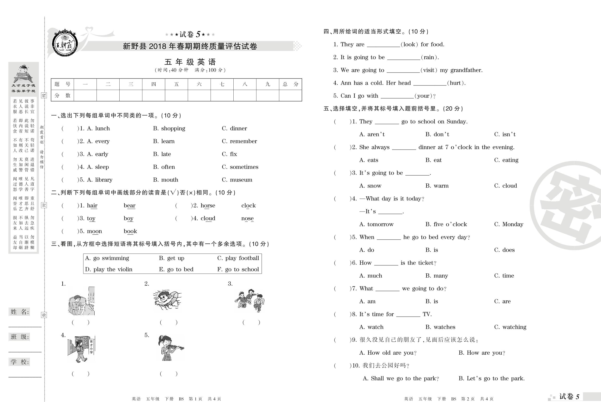 2017-2018学年第二学期南阳市新野县五年级英语试卷(北师版)【5】