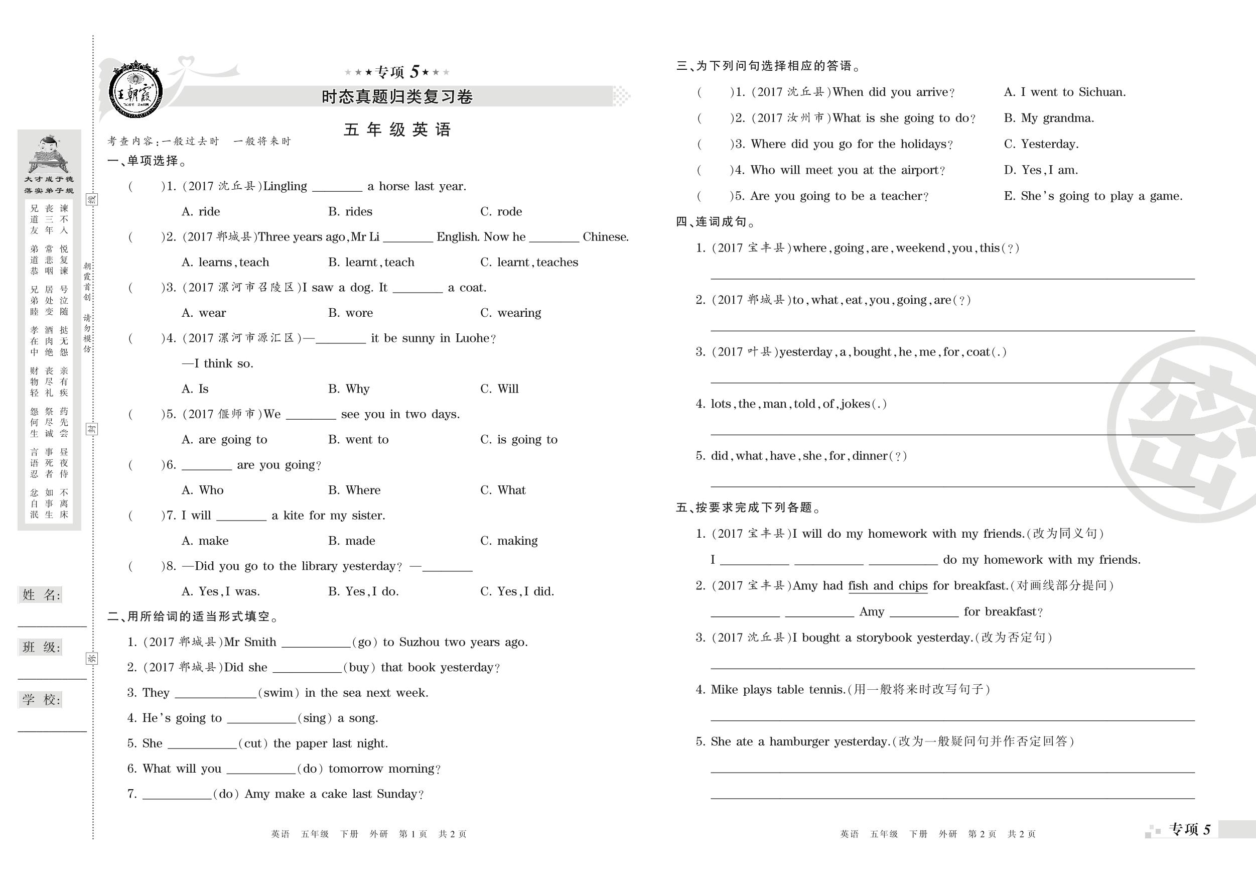 王朝霞期末专项卷——时态、情景交际真题归类复习卷五年级下册英语(外研版)_R210807144627【0】