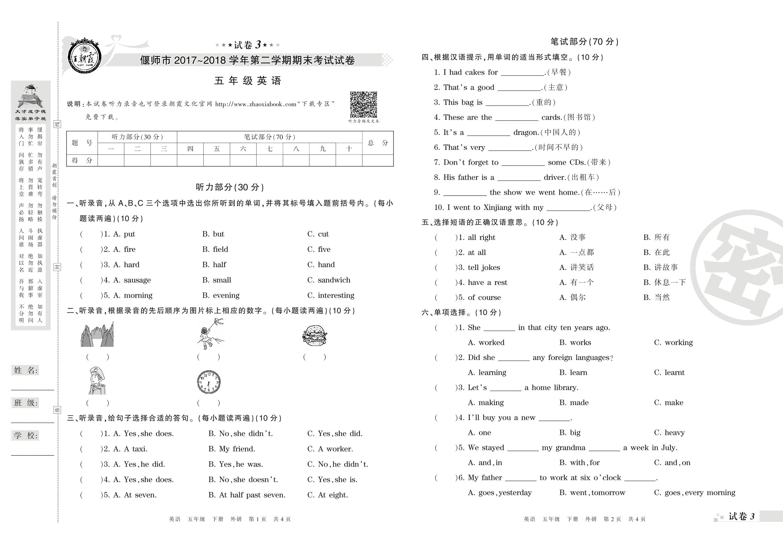 2017-2018学年第二学期偃师市五年级英语试卷(外研版)【3】