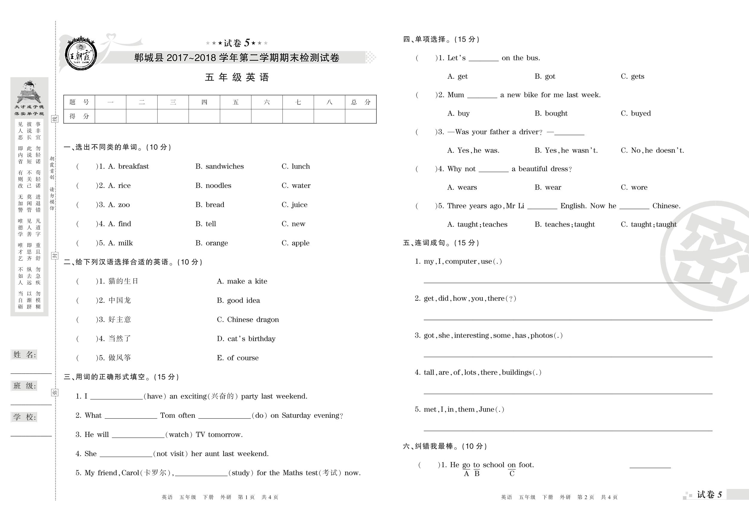 2017-2018学年第二学期周口市郸城县五年级英语试卷(外研版)【5】