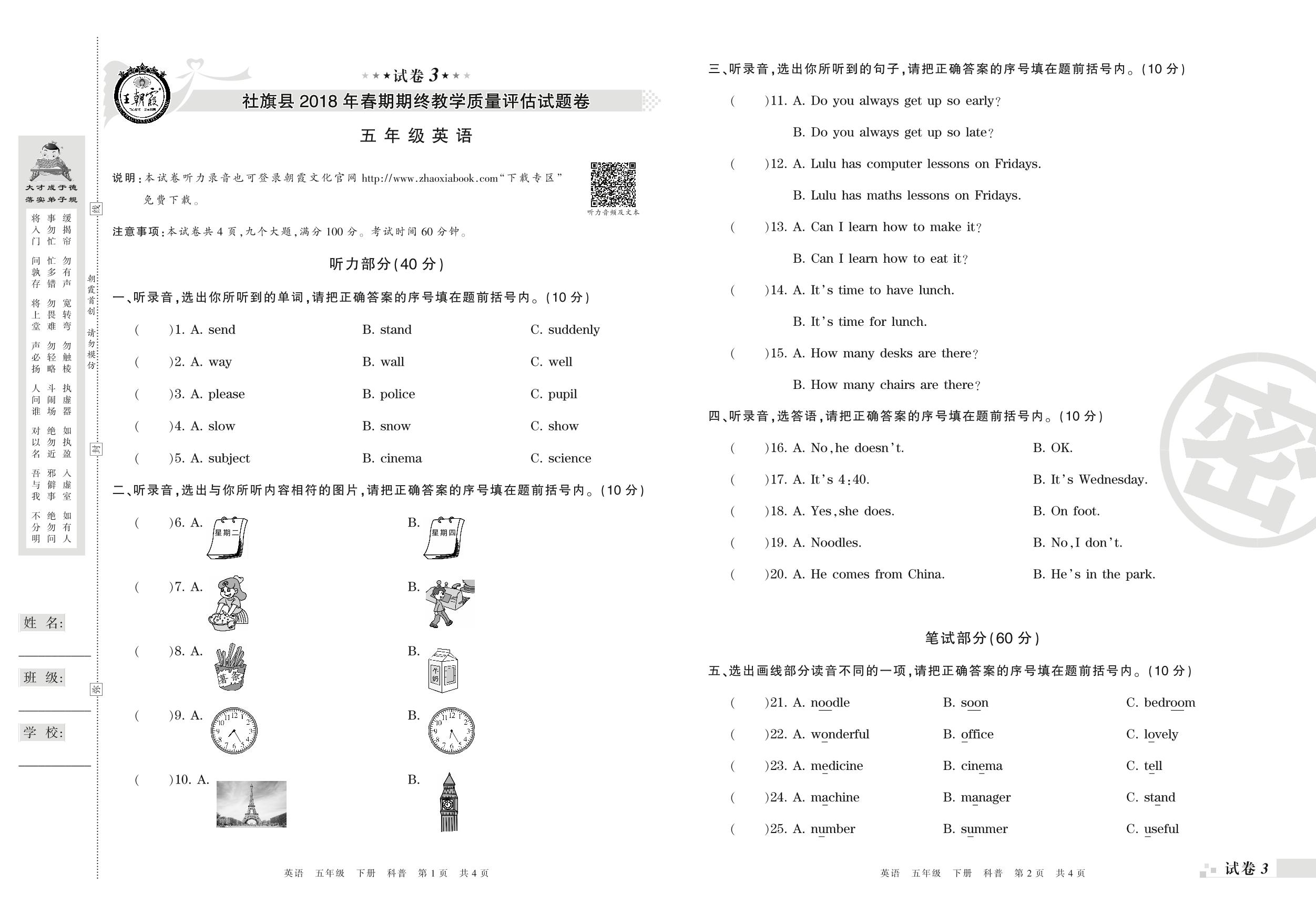 2017-2018学年第二学期南阳市社旗县五年级英语试卷(科普版)【3】