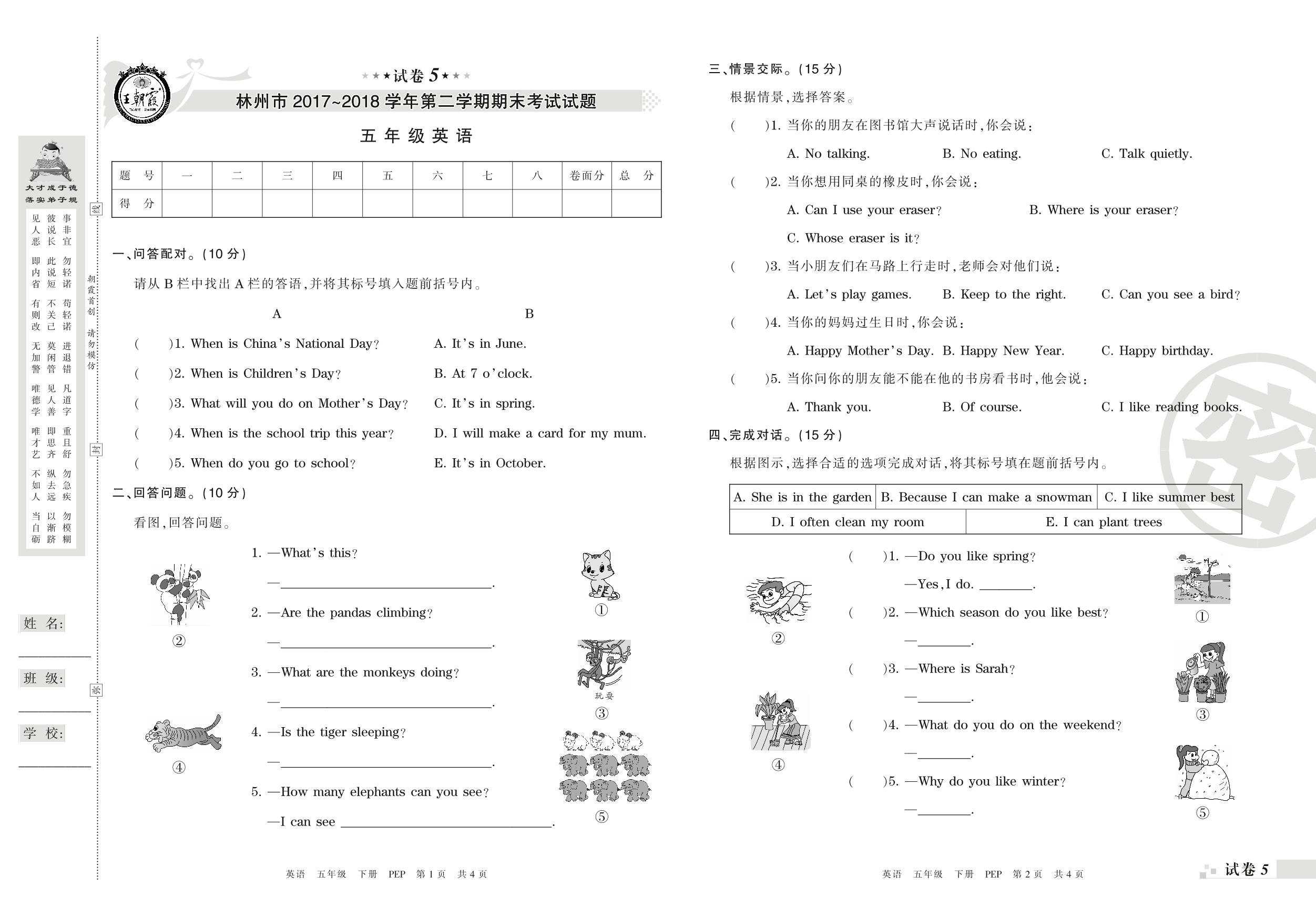 2017-2018学年第二学期林州市五年级英语试卷(PEP版)【5】