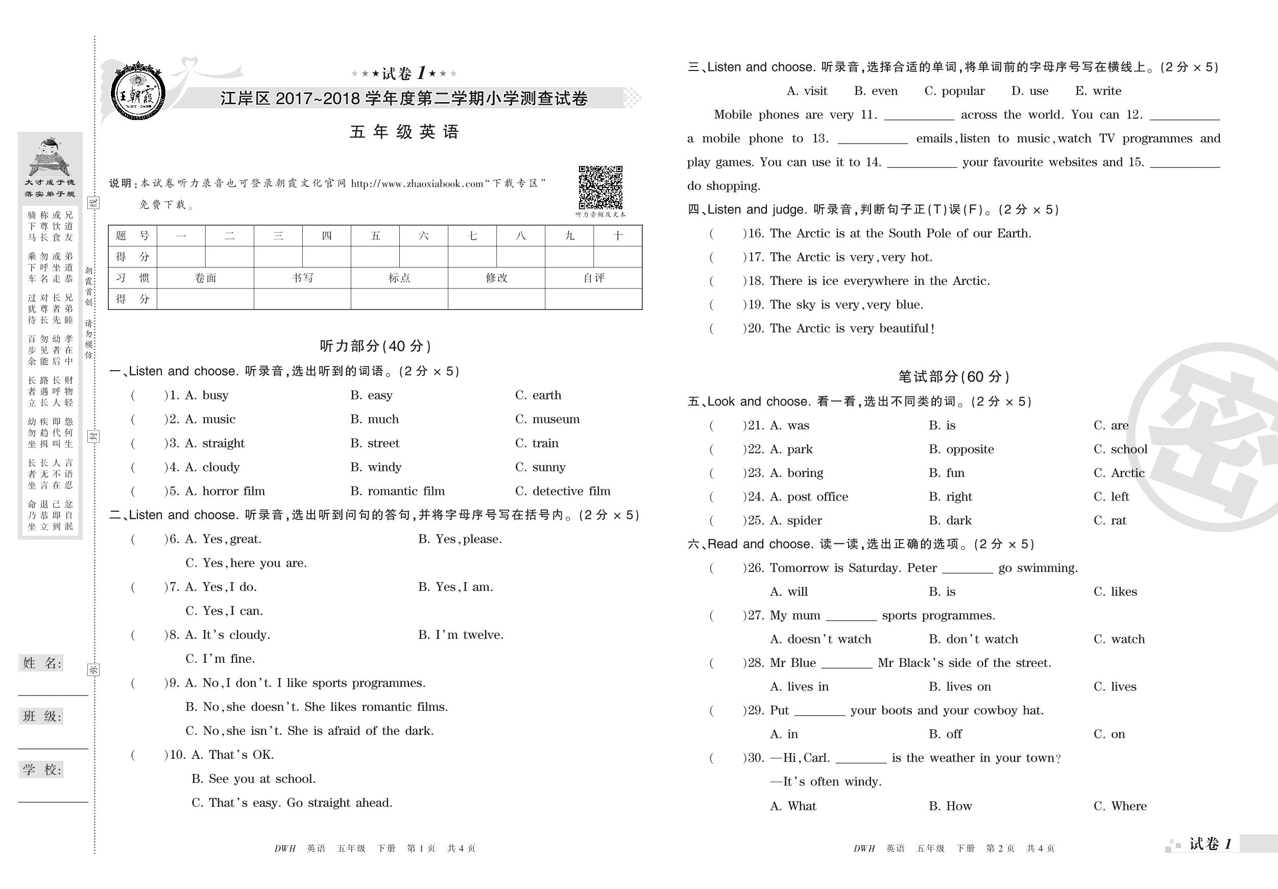 2017-2018学年第二学期武汉市江岸区五年级英语试卷(剑桥版)【1】