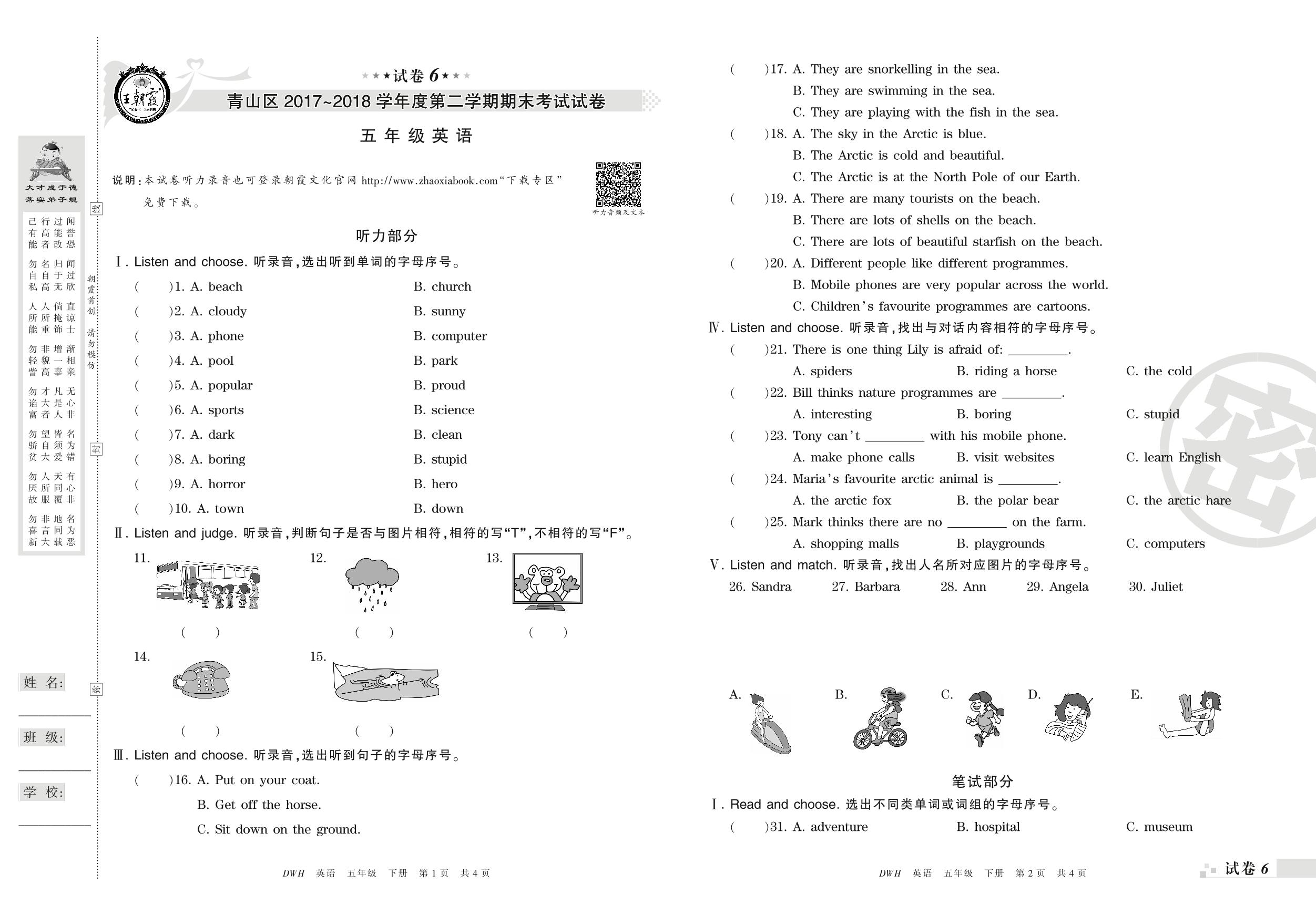 2017-2018学年第二学期武汉市青山区五年级英语试卷(剑桥版)【6】