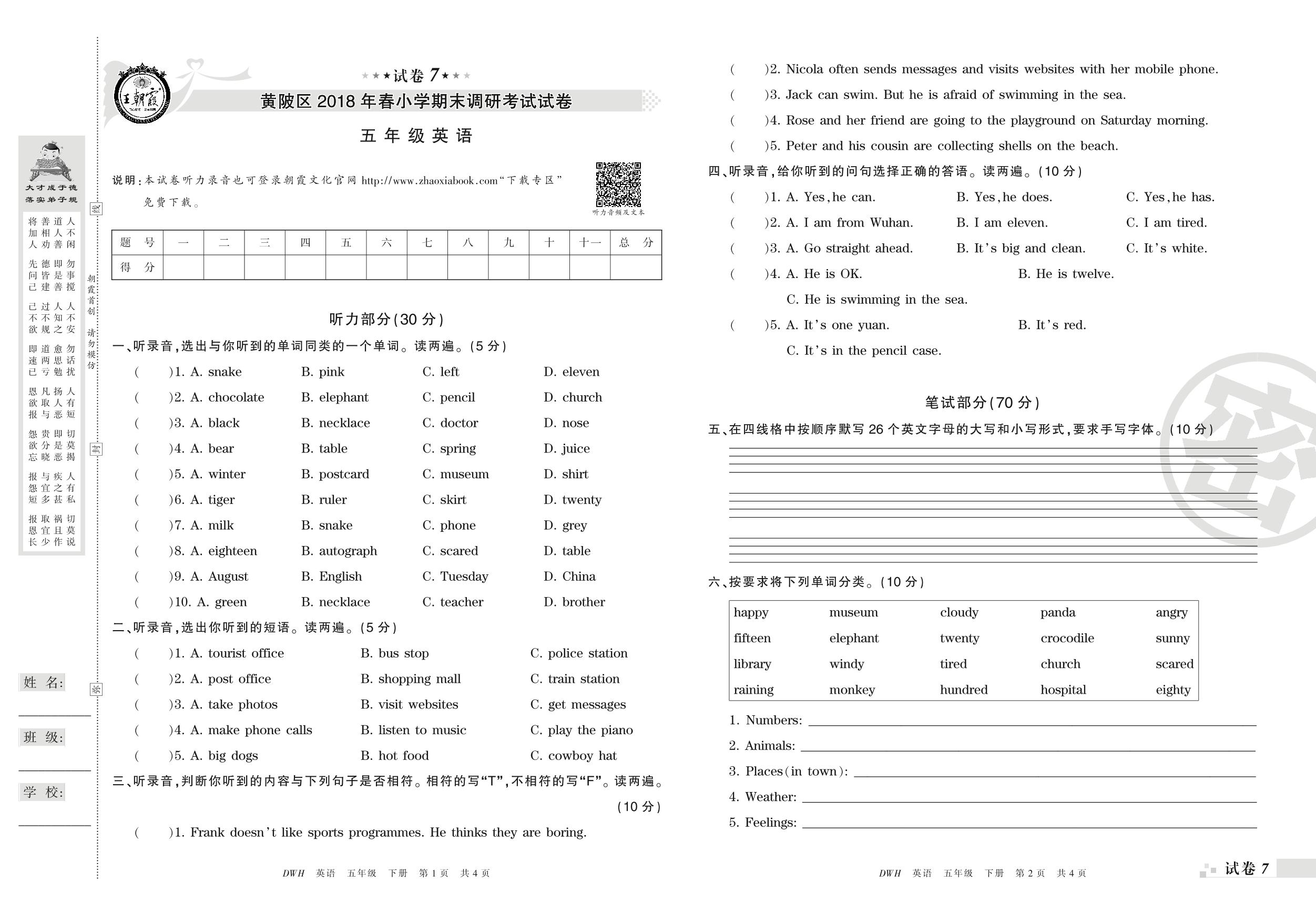 2017-2018学年第二学期武汉市黄陂区五年级英语试卷(剑桥版)【7】