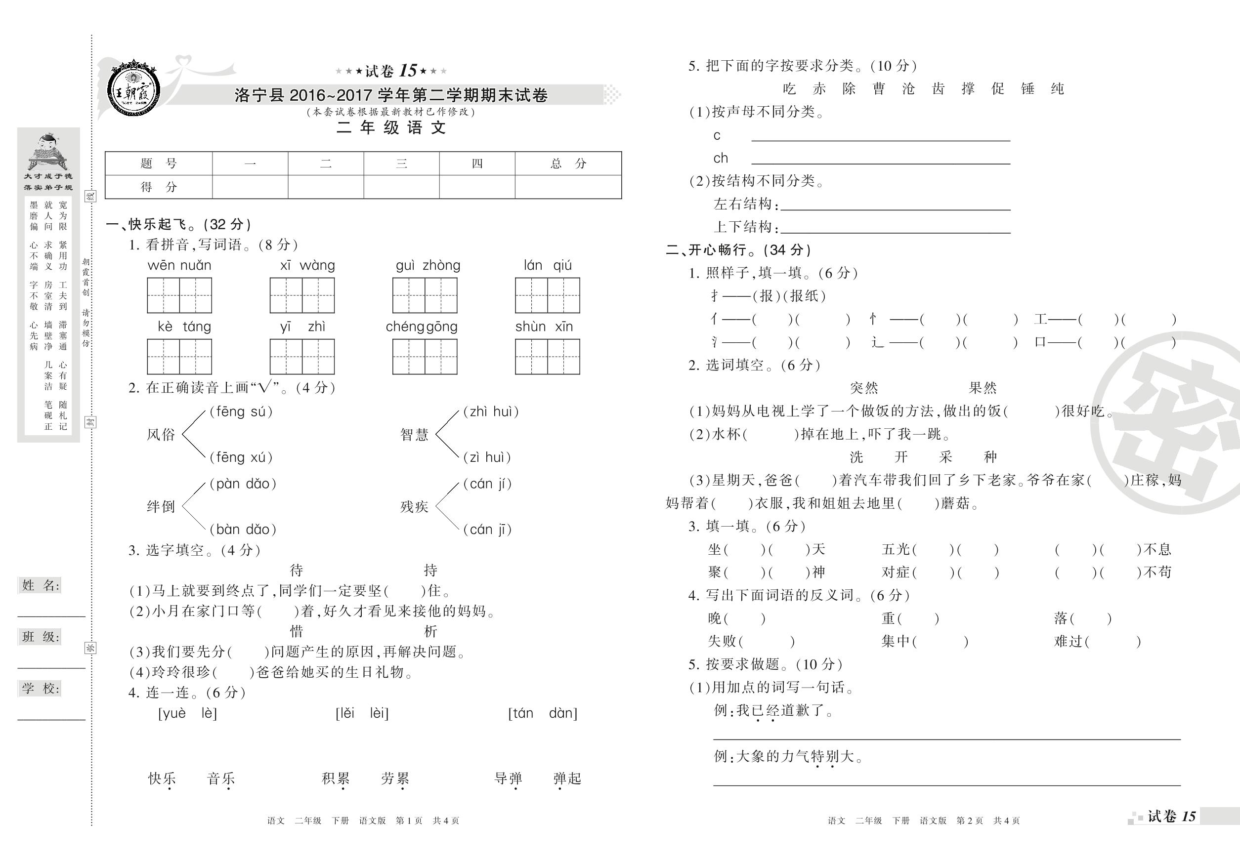 2016-2017学年第二学期洛阳市洛宁县二年级语文试卷(语文版)【15】