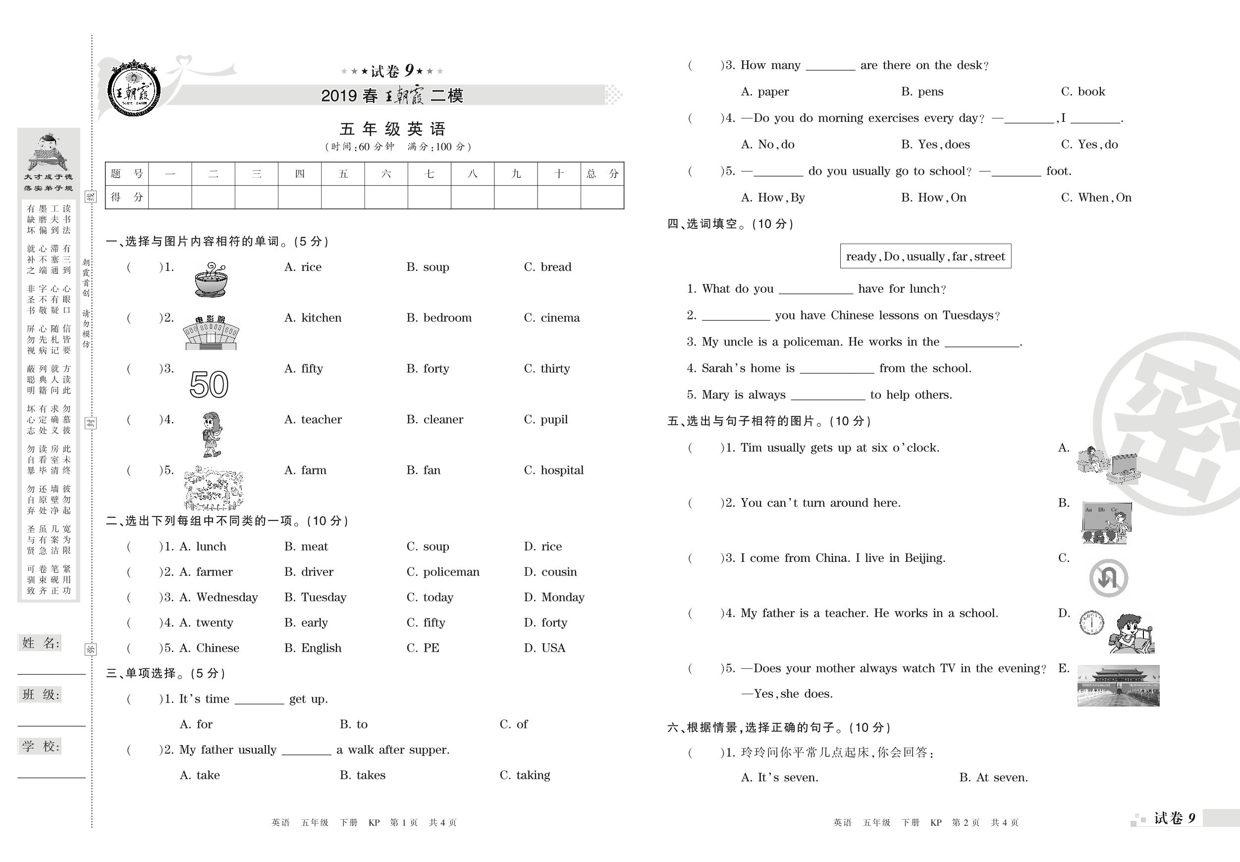 王朝霞期末模拟卷五年级下册英语(科普版)_R210807145122【9】