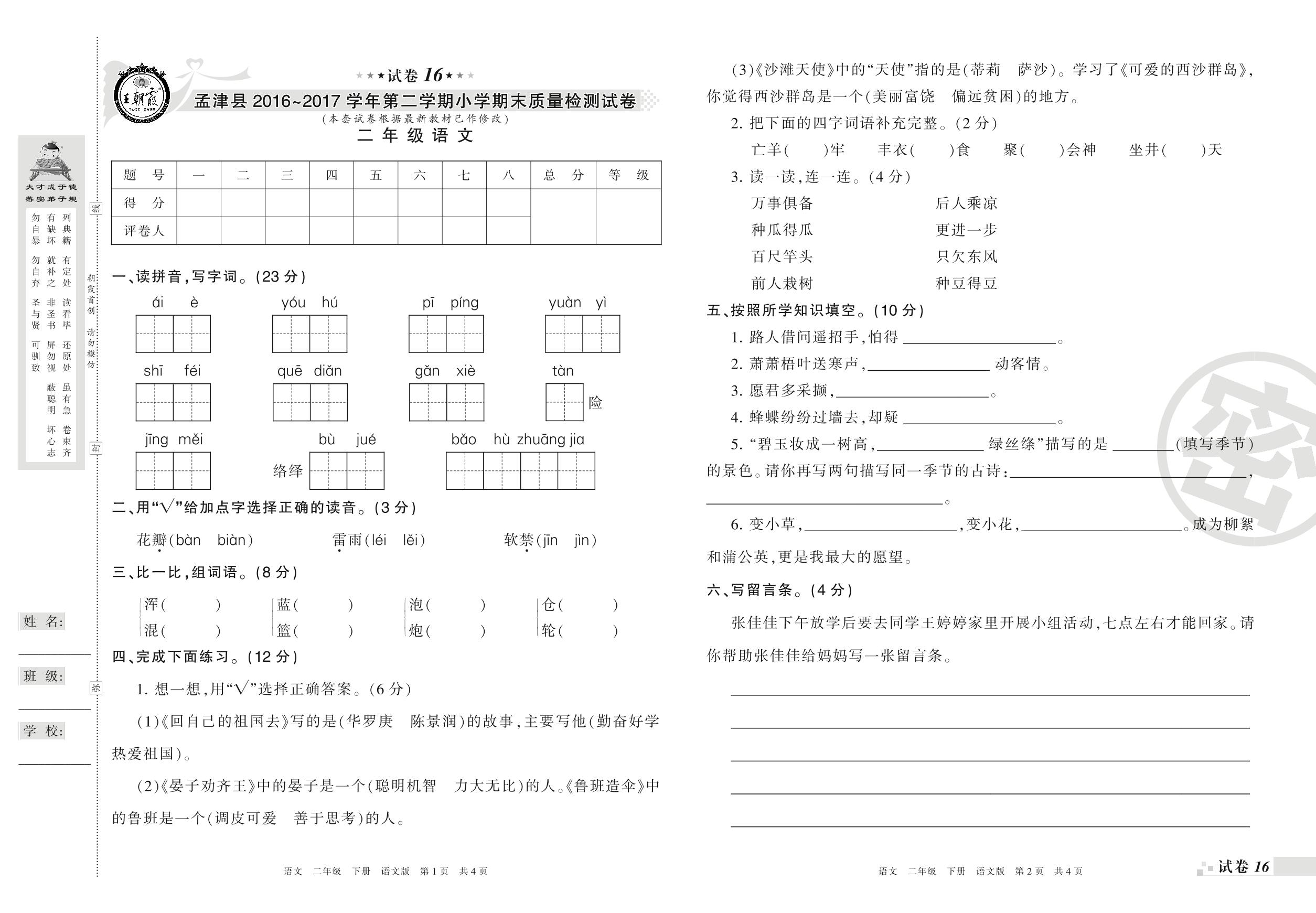 2016-2017学年第二学期洛阳市孟津县二年级语文试卷(语文版)【16】