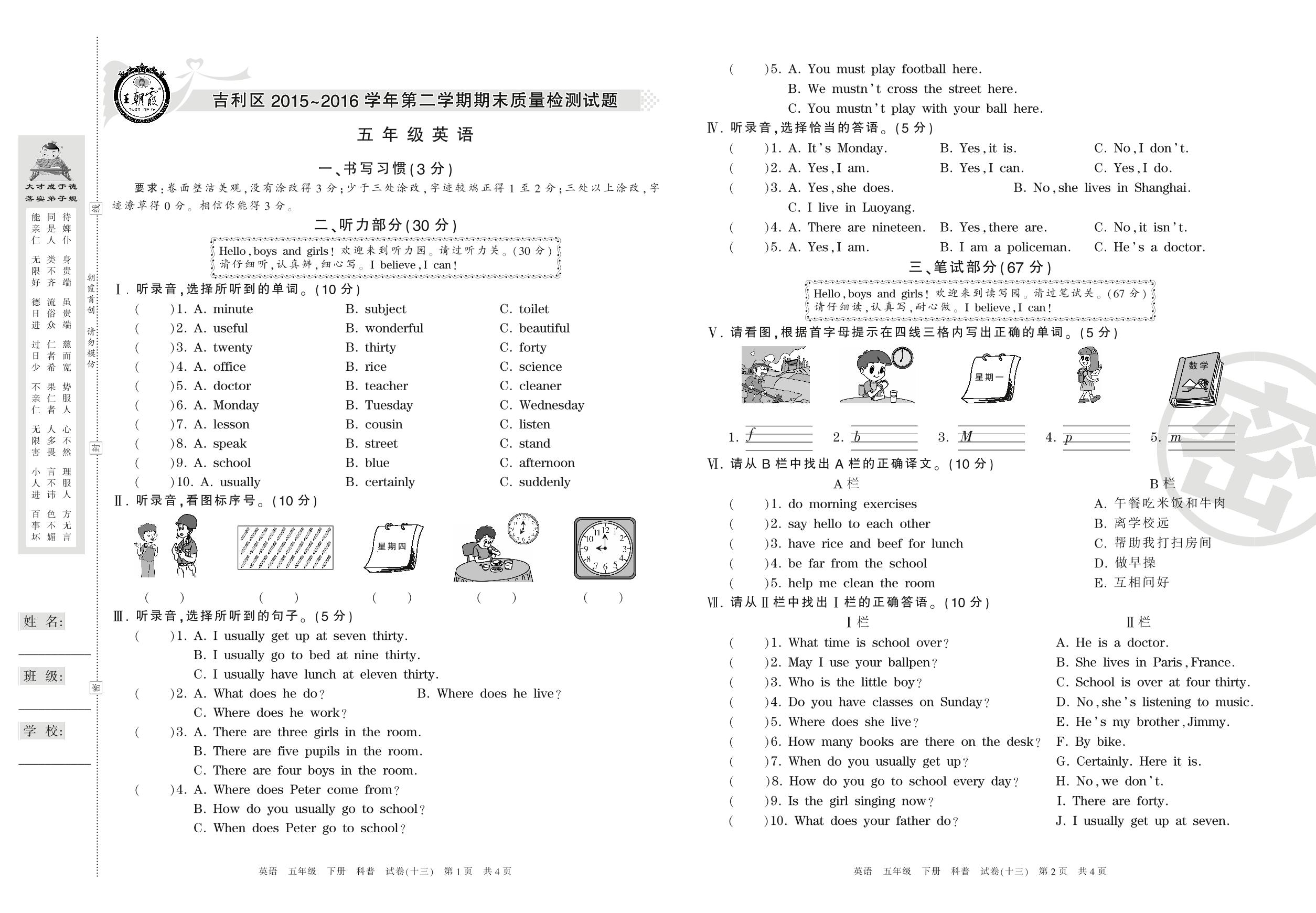 2015-2016学年第二学期洛阳市吉利区五年级英语试卷(科普版)【13】