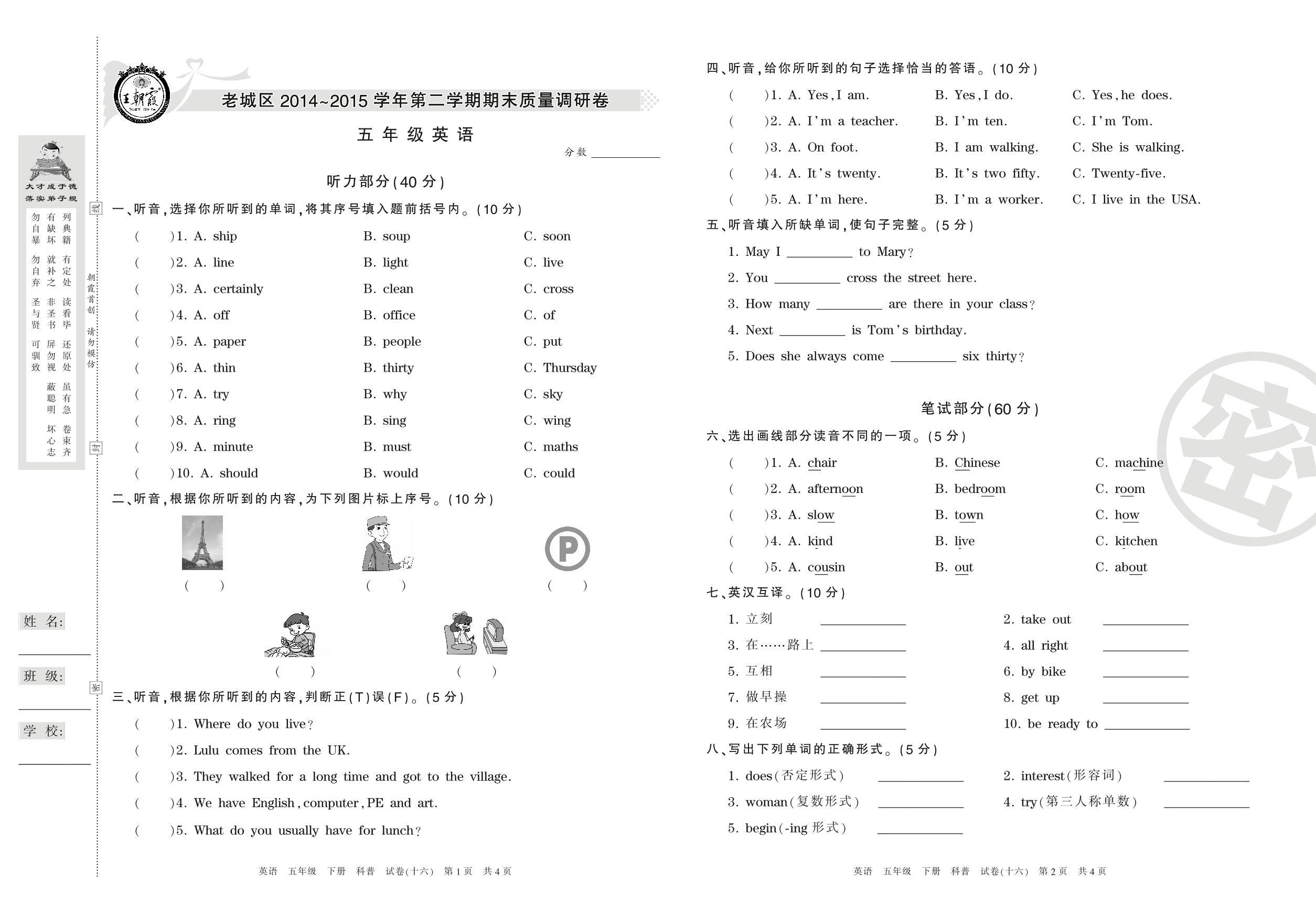 2015-2016学年第二学期洛阳市老城区五年级英语试卷(科普版)【16】