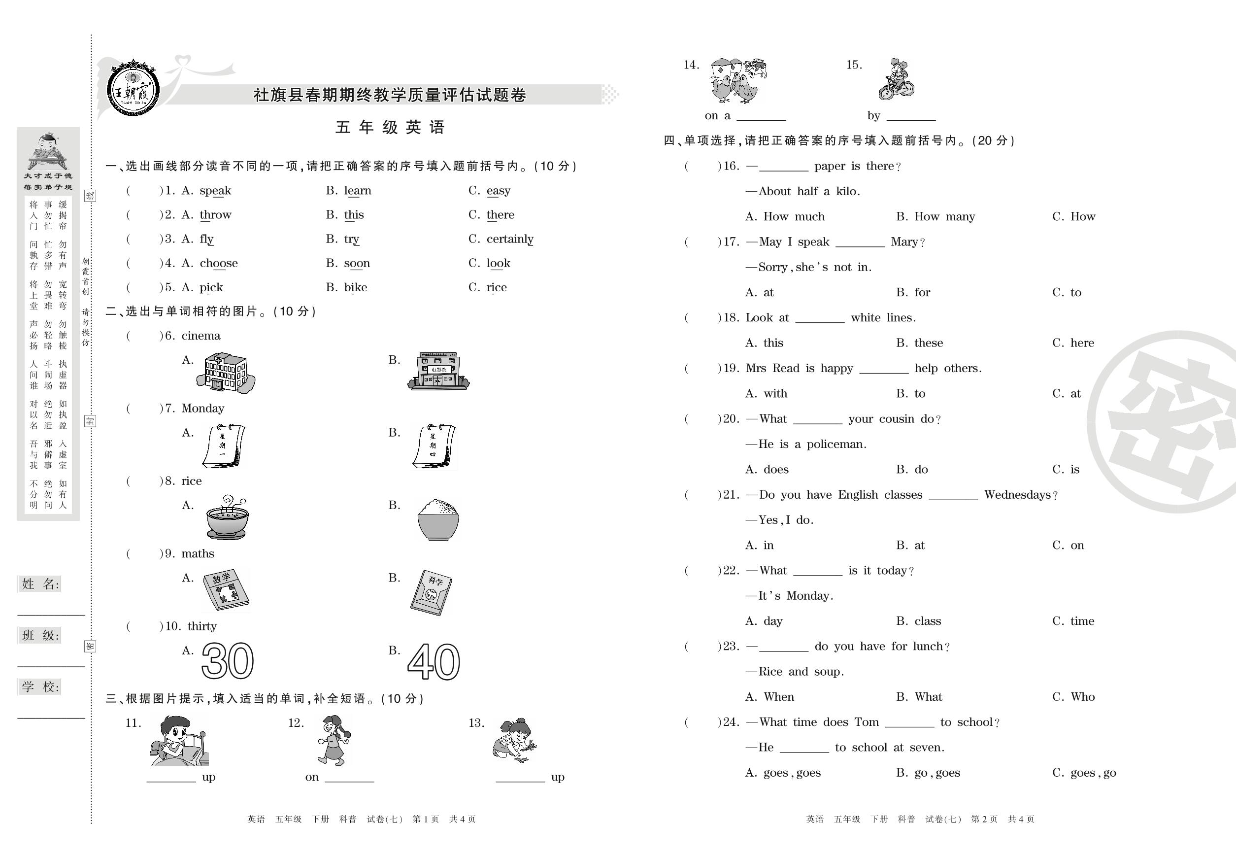 2015-2016学年第二学期南阳市社旗县五年级英语试卷(科普版)【7】