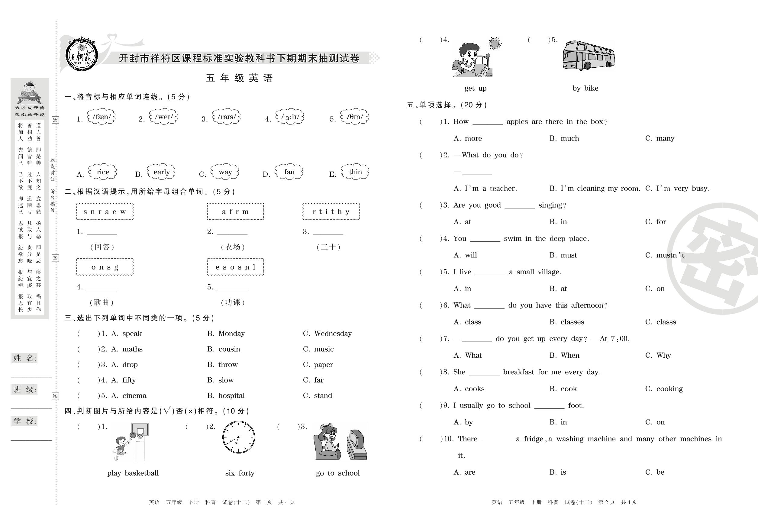 五年级英语科普版下册期末卷