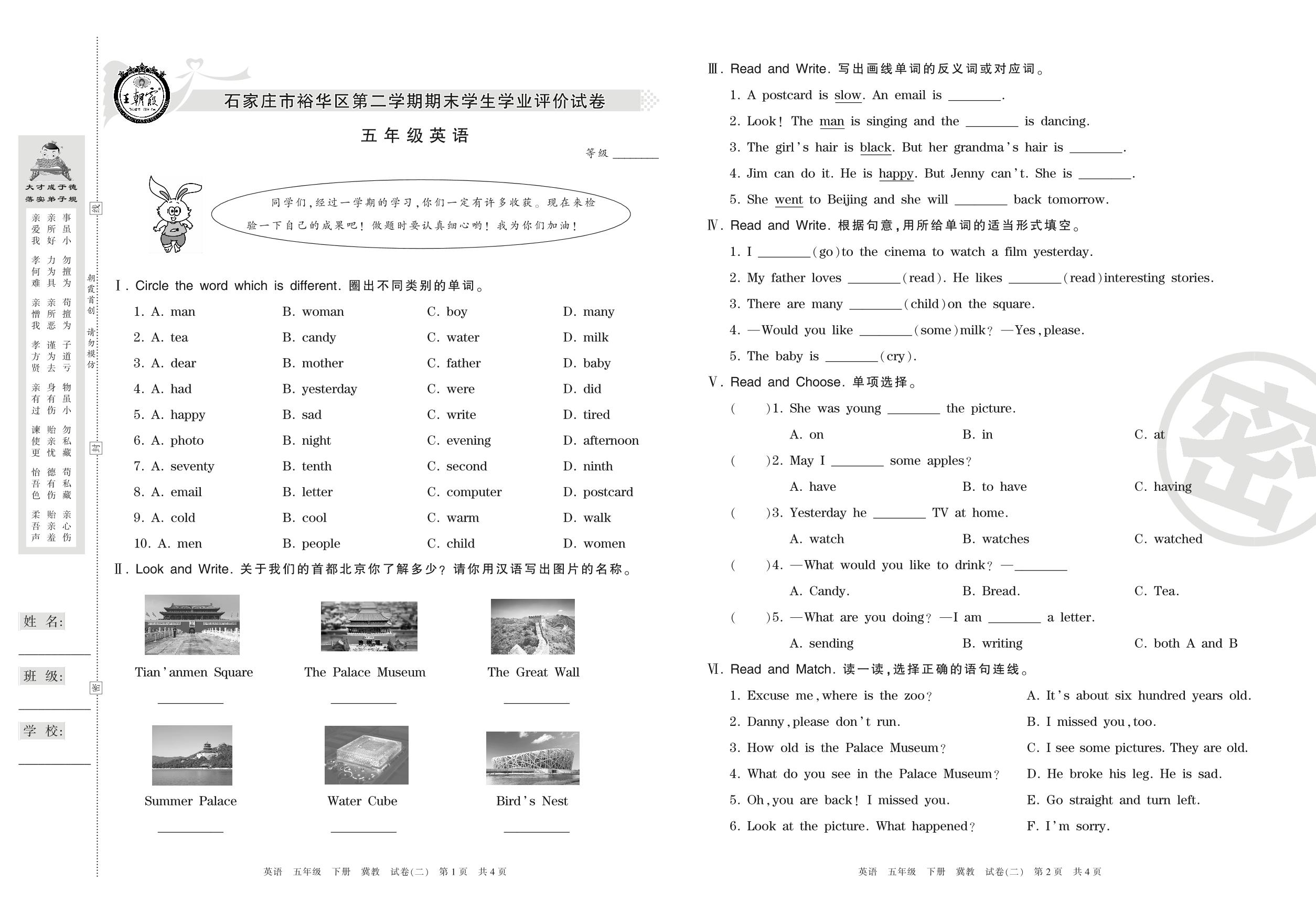 2015-2016学年第二学期石家庄市裕华区五年级英语试卷(冀教版)【2】