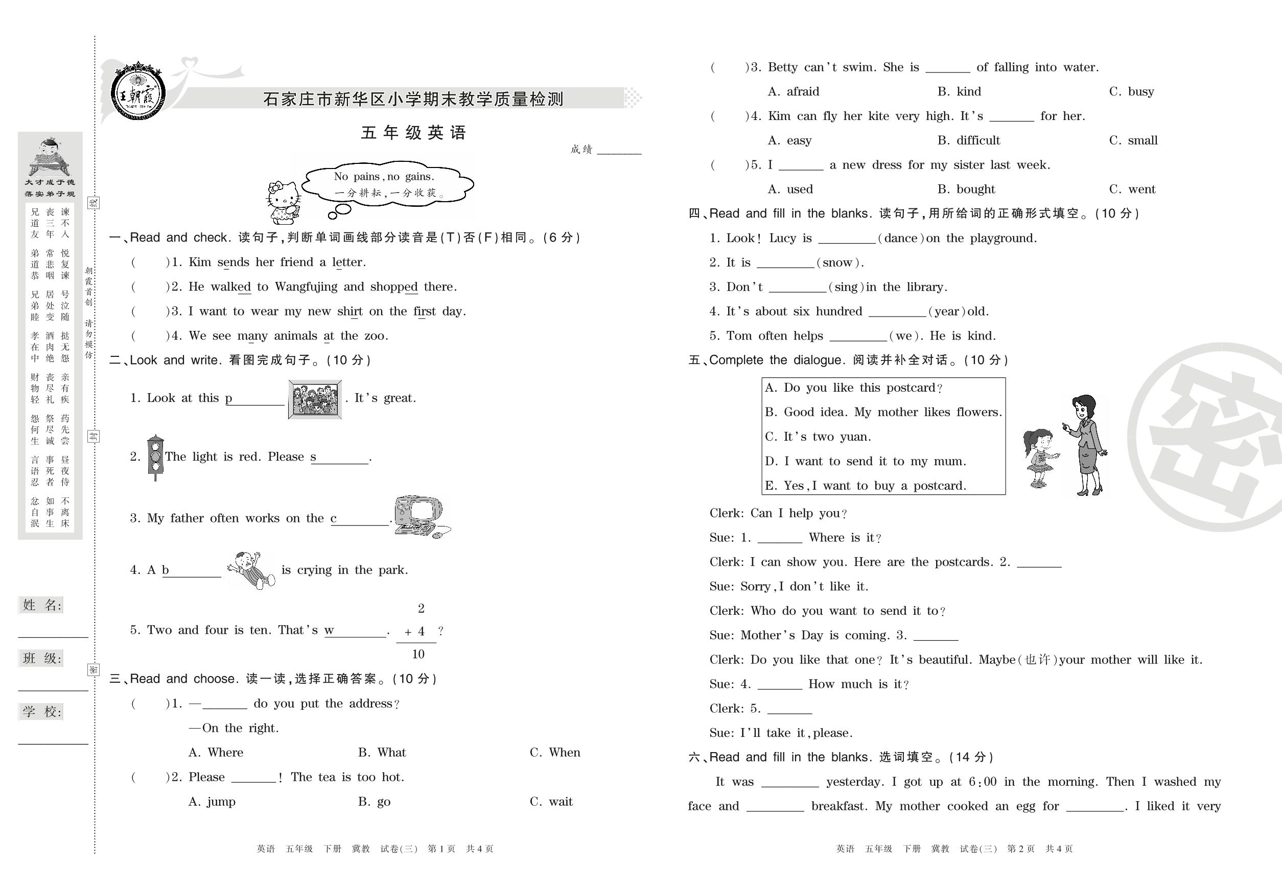 2015-2016学年第二学期石家庄市新华区五年级英语试卷(冀教版)【3】