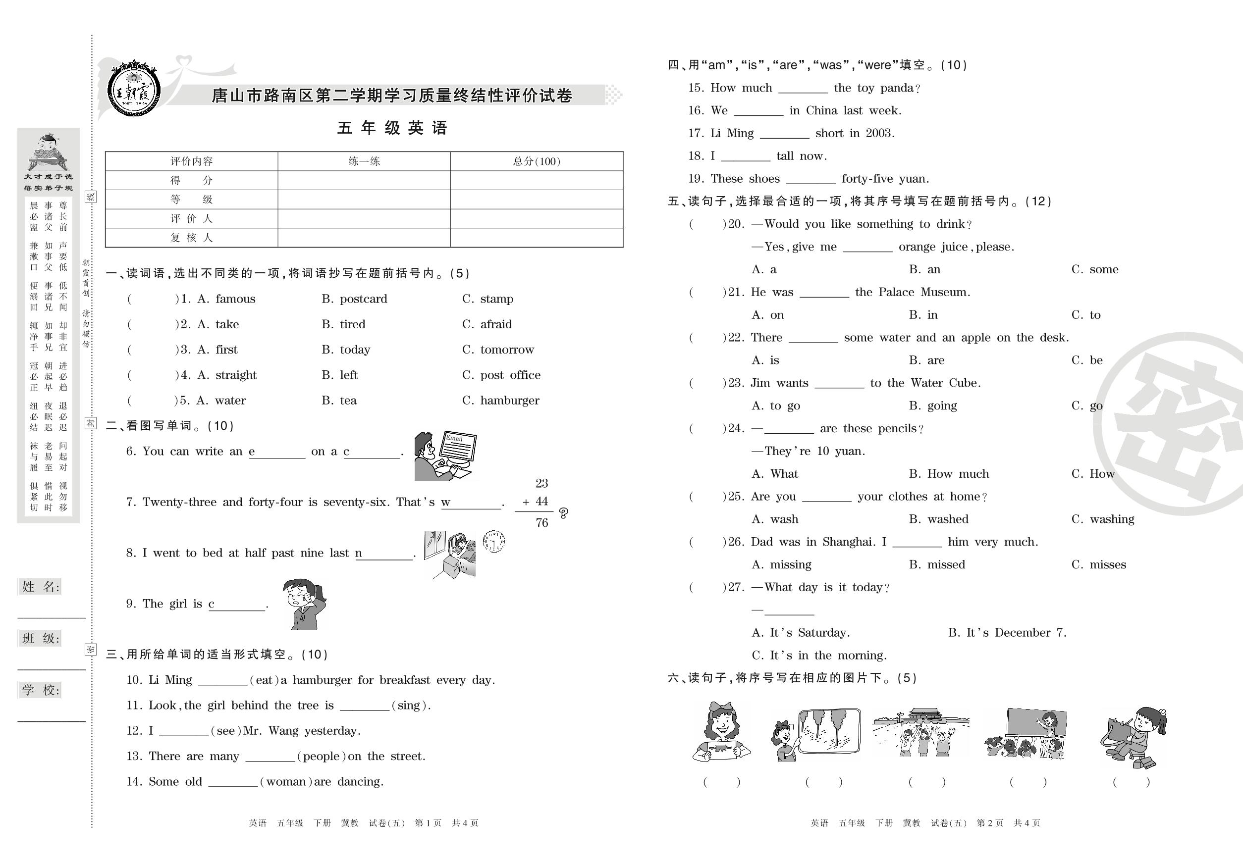 2015-2016学年第二学期唐山市路南区五年级英语试卷(冀教版)【5】