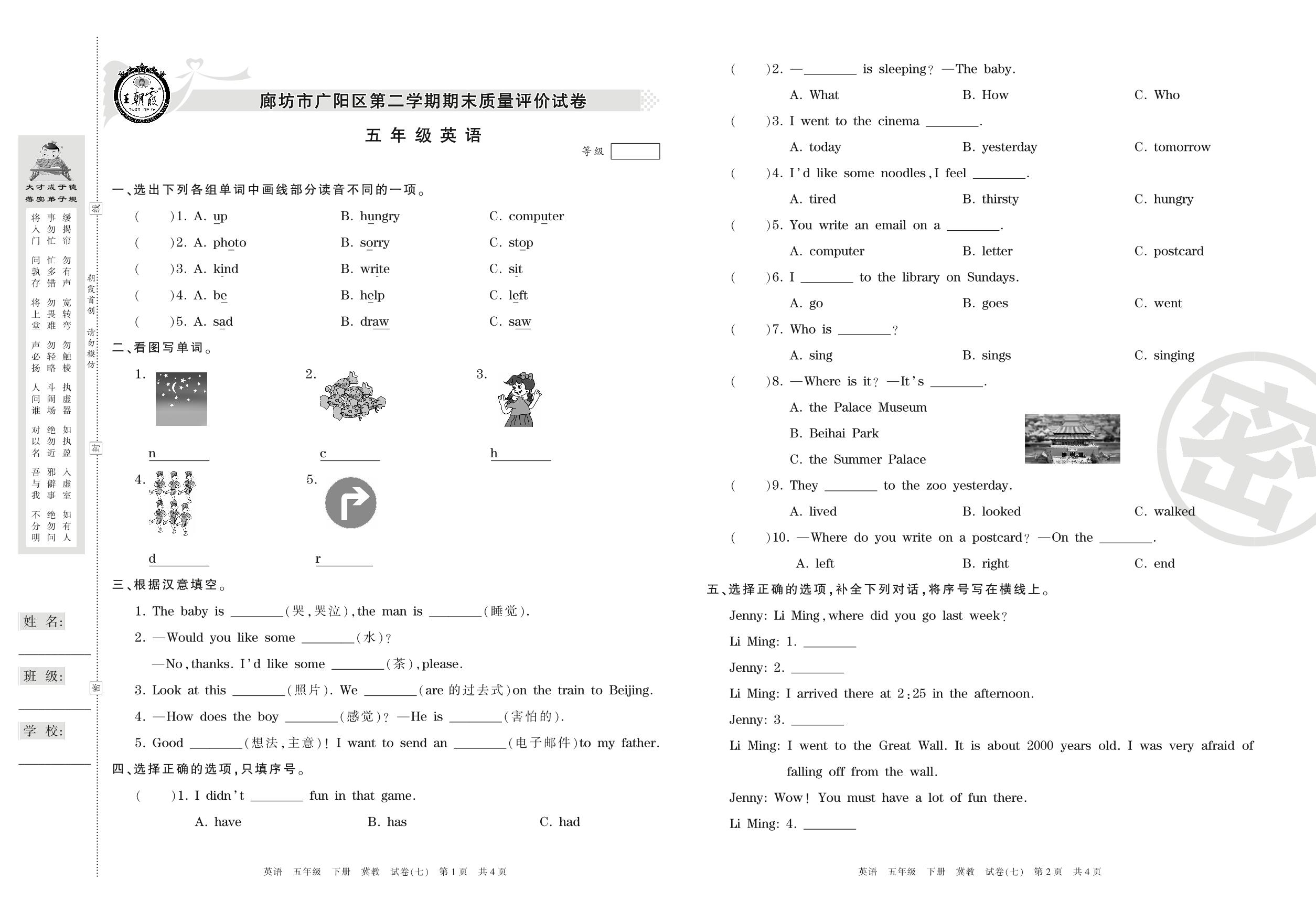 2015-2016学年第二学期廊坊市广阳区五年级英语试卷(冀教版)【7】