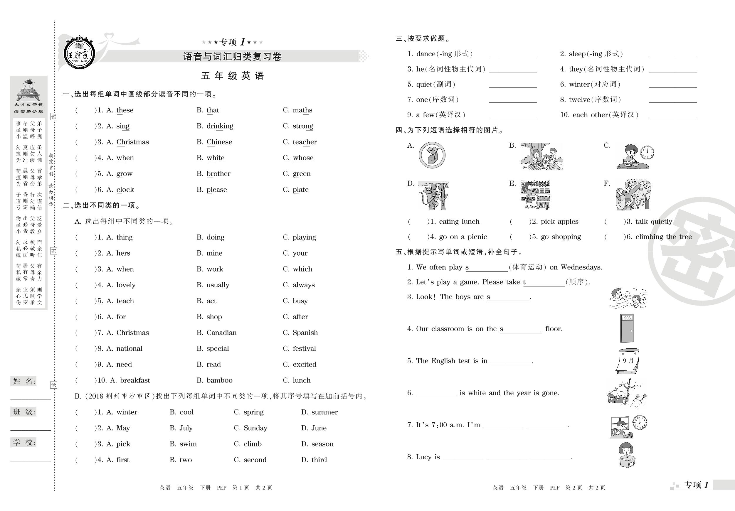 王朝霞期末专项卷——语音与词汇、句子真题归类复习卷五年级下册英语(PEP版)_R210807145437【0】
