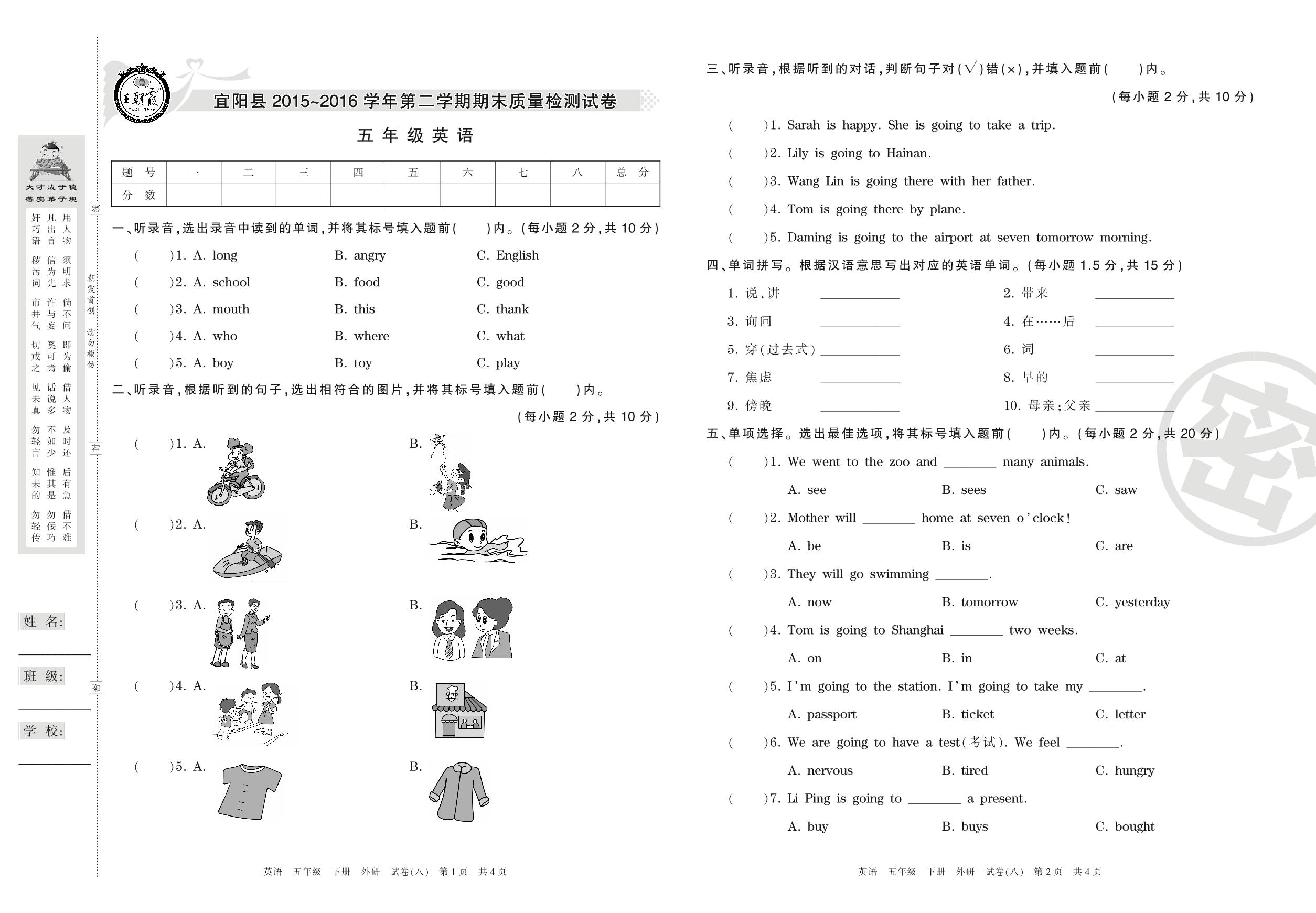 2015-2016学年第二学期洛阳市宜阳县五年级英语试卷(外研版)【8】